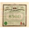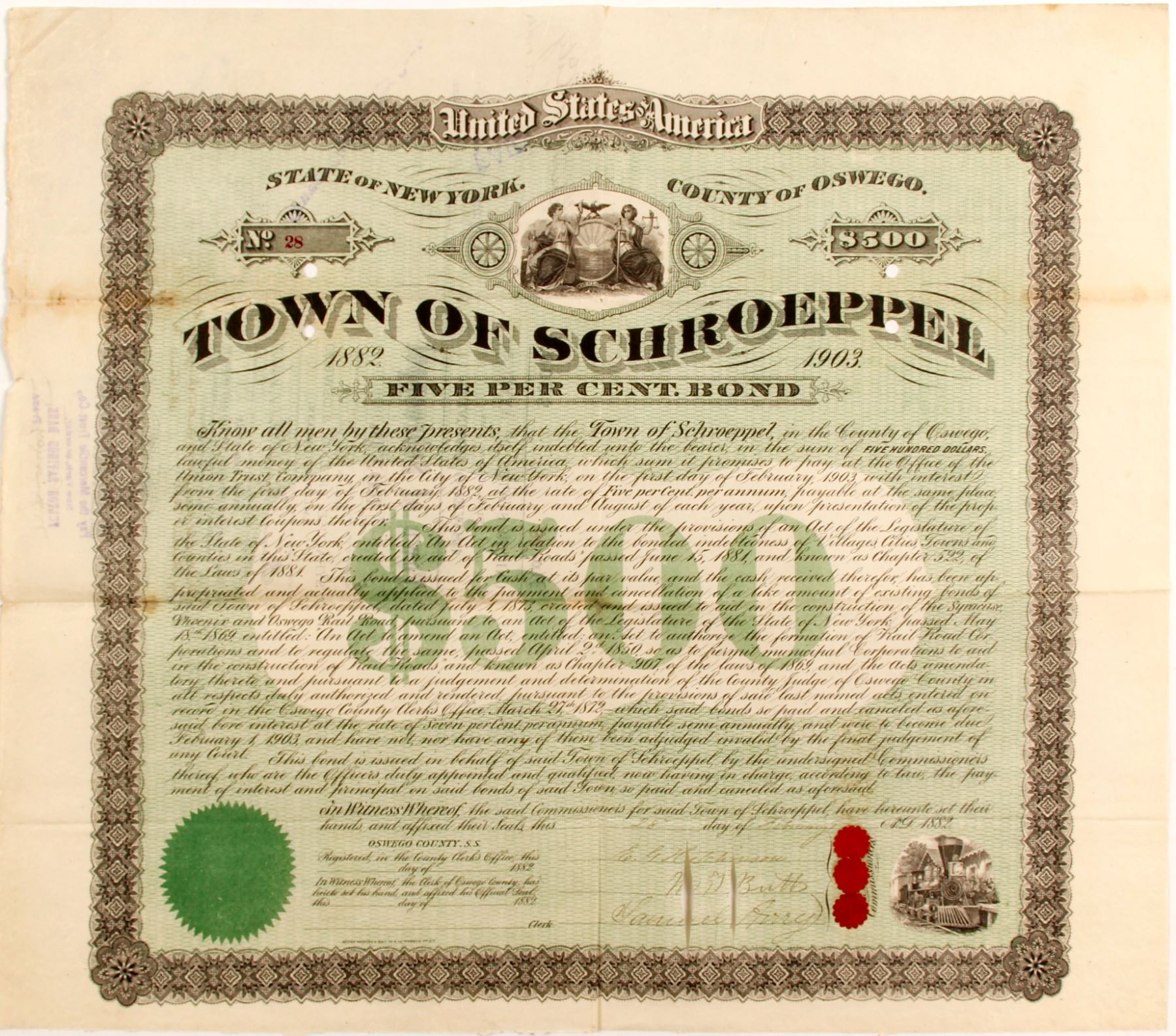 Unlisted #28 $500 signed by President illegible. Town of Schroeppel, NY. "The Syracuse, Phoenix and Oswego Railroad was chartered on November 29, 1871, and had a route from Woodard, located north of Syracuse, New York, to Fulton, New York, a distance of 17.11 miles (27.54 km).[1] They merged with the Syracuse Northwestern Railroad on June 10, 1875, and incorporated as Syracuse, Phoenix and Oswego Railway on February 16, 1885. In 1889, the railroad line merged with Rome, Watertown and Ogdensburg Railroad until 1913, when the company became part of the New York Central and Hudson River Railroad which was renamed to New York Central Railroad in 1914. from wikipedia.com. Prag Collection.