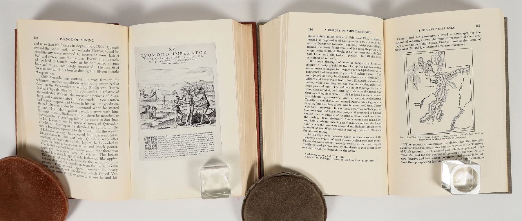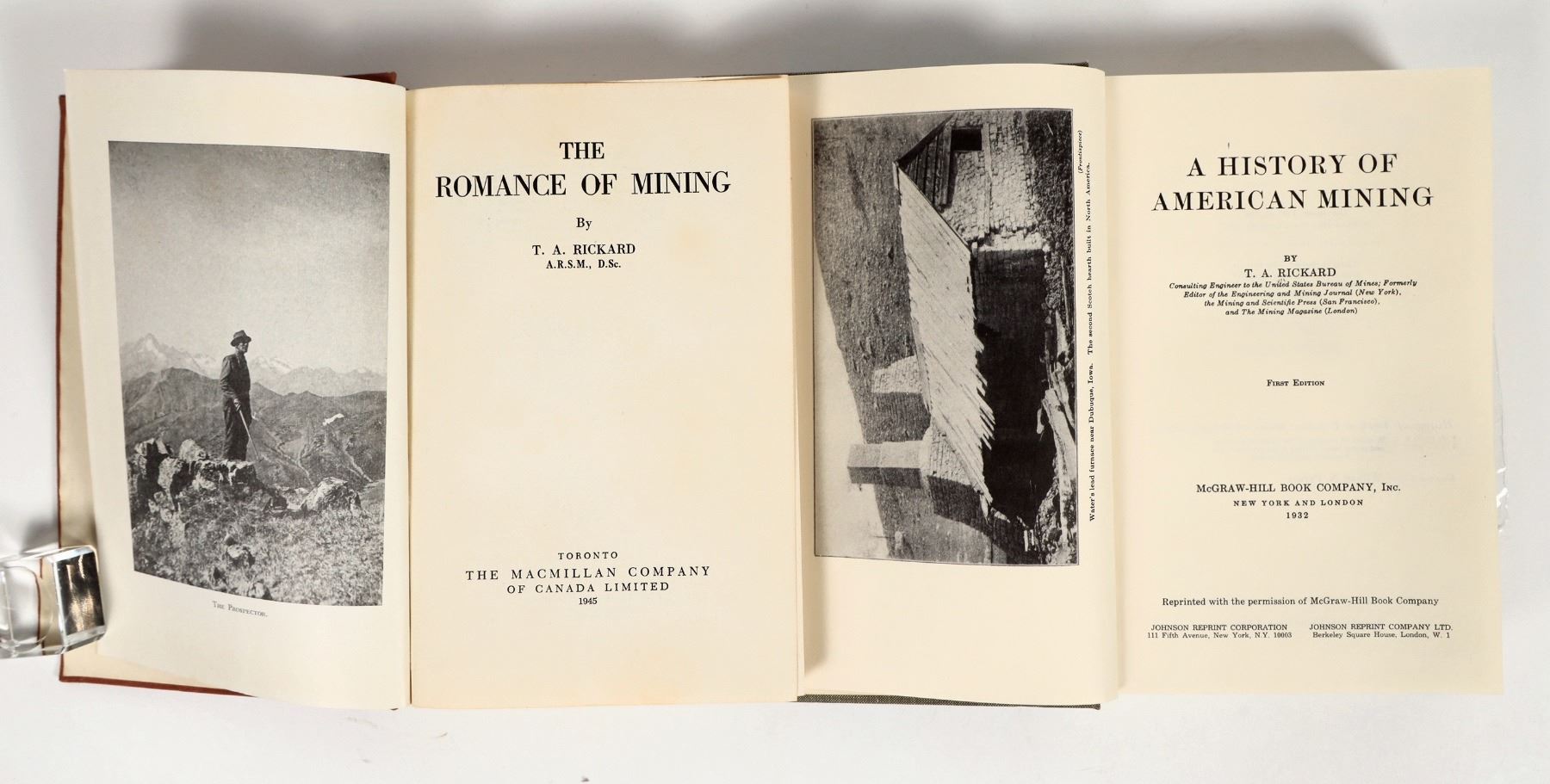 A pair of books on mining by T. A. Rickard, a significant mining engineer and author on mining who worked in United States, Europe and Australia throughout the late 1800s and early 1900s. Lot includes "A History of American Mining" (originally pub. 1932) and "The Romance of Mining" (originally pub. 1944). These copies are 1966 and 1945 reprints, respectively. Both hardback w/ fabric binding and gilt text on cover. Both in great condition; see photos.