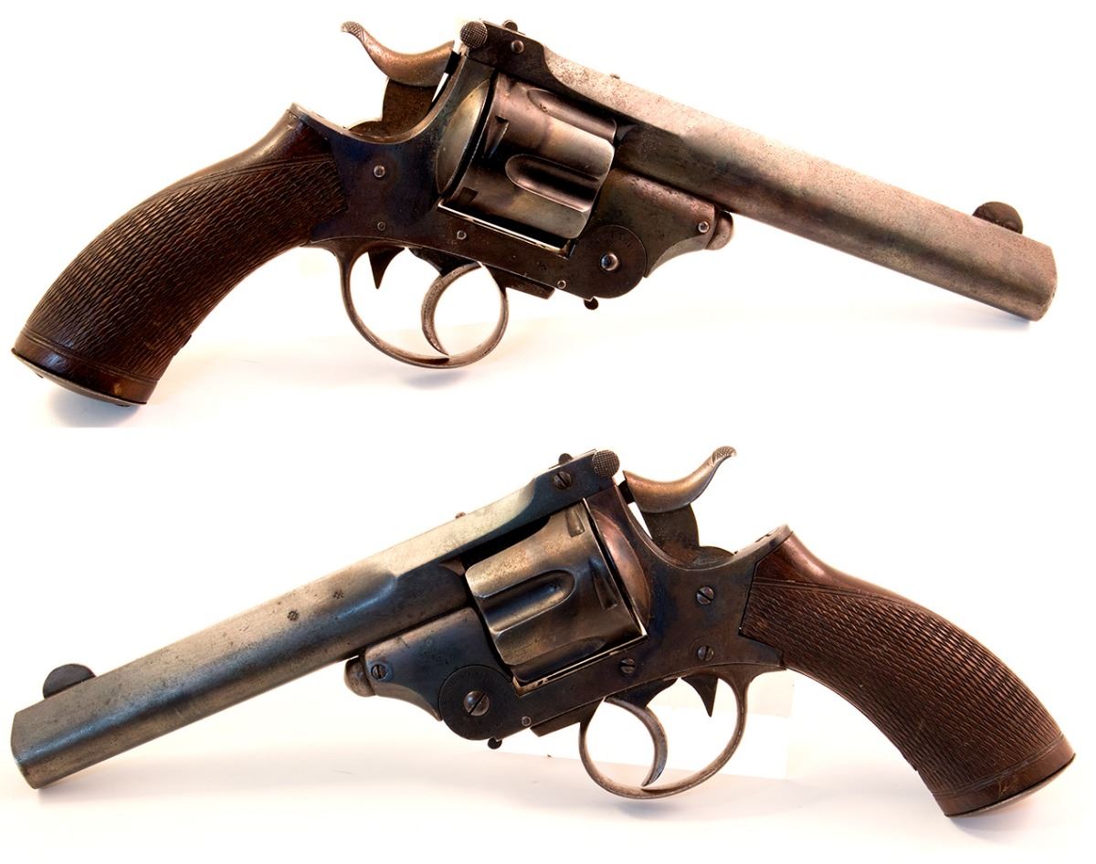 Excellent and rare T. Bland and Sons Webley Service revolver, most likely for the commercial market. Original bluing fading to a nice aged patina. Nice checkered walnut grips in excellent shape. Double action/single action mechanism in great working order. 5 ½ inch barrel length with British proof marks on the barrel and cylinder flutes. Left side receiver has” T.BLAND SELF EXTRACTING ARMY REVOLVER” on the barrel hinge. The right side receiver says “455 gauge.” The top barrel flat says “T.BLAND, 106, STRAND, LONDON.” Black powder antique. State: City: Date: FHWAC#: 42732