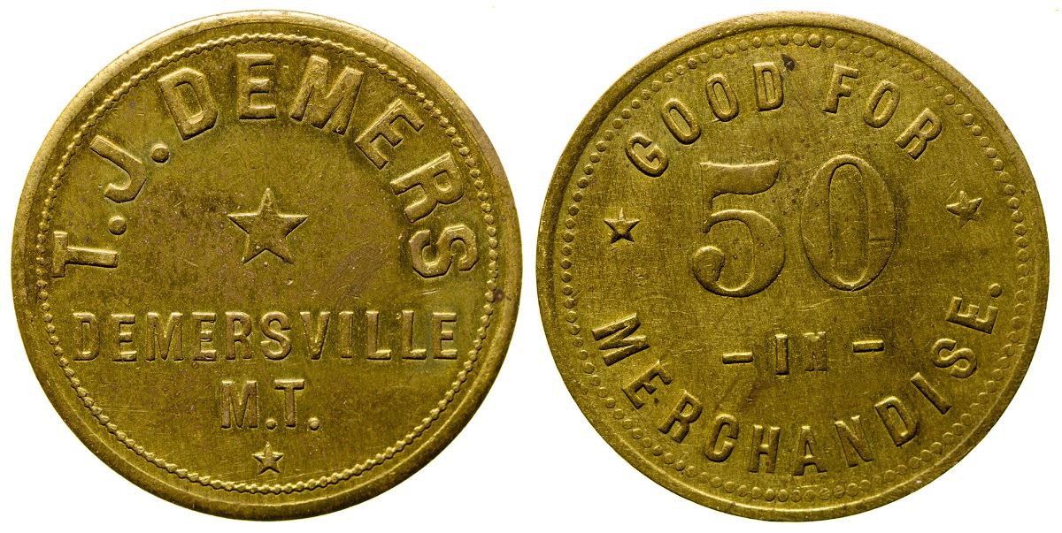 R-11. Montana Territory. Less than four of these tokens are known. T. J. Demers / Demersville / M. T. //GF / 50c / In/ Merchandise. Round, brass, 30mm. Demersville was in Flathead County, 3 miles from Kalispell. It was at the head of navigation for the Flathead River and on both the Great Northern and Northern Pacific Railroads. T. J. Demers, the town's namesake, ran a General Store in the 1880's and died before the turn of the decade to 1890. (Svoboda Collection) City: Demersville State: Montana Date: c.1880s HWAC# 35003