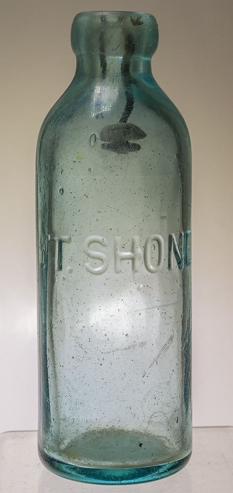 T. Shone. Aqua Hutch soda bottle, mint. Impurities in the glass at the lip. This is a very rare bottle used in Winnemucca and the Bishop area by Shone. Very difficult to find. State: Nevada City: Winnemucca Date: ID# 47524