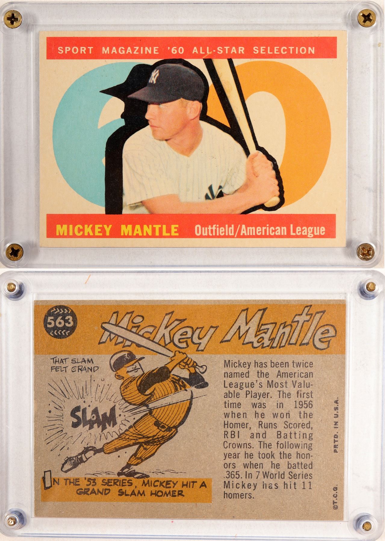This is a TOPPS, 1960, 563, All Star Mickey Mantle card. Front is a picture of Mickey holding a bat with the number 60 behind him in blue and yellow. Reverse shows a cartoon of Mantle with a brief history. Card in good condition. Edges are and corners are a bit worn. Surface has a few smudges on the front. City: State: Date: 1960