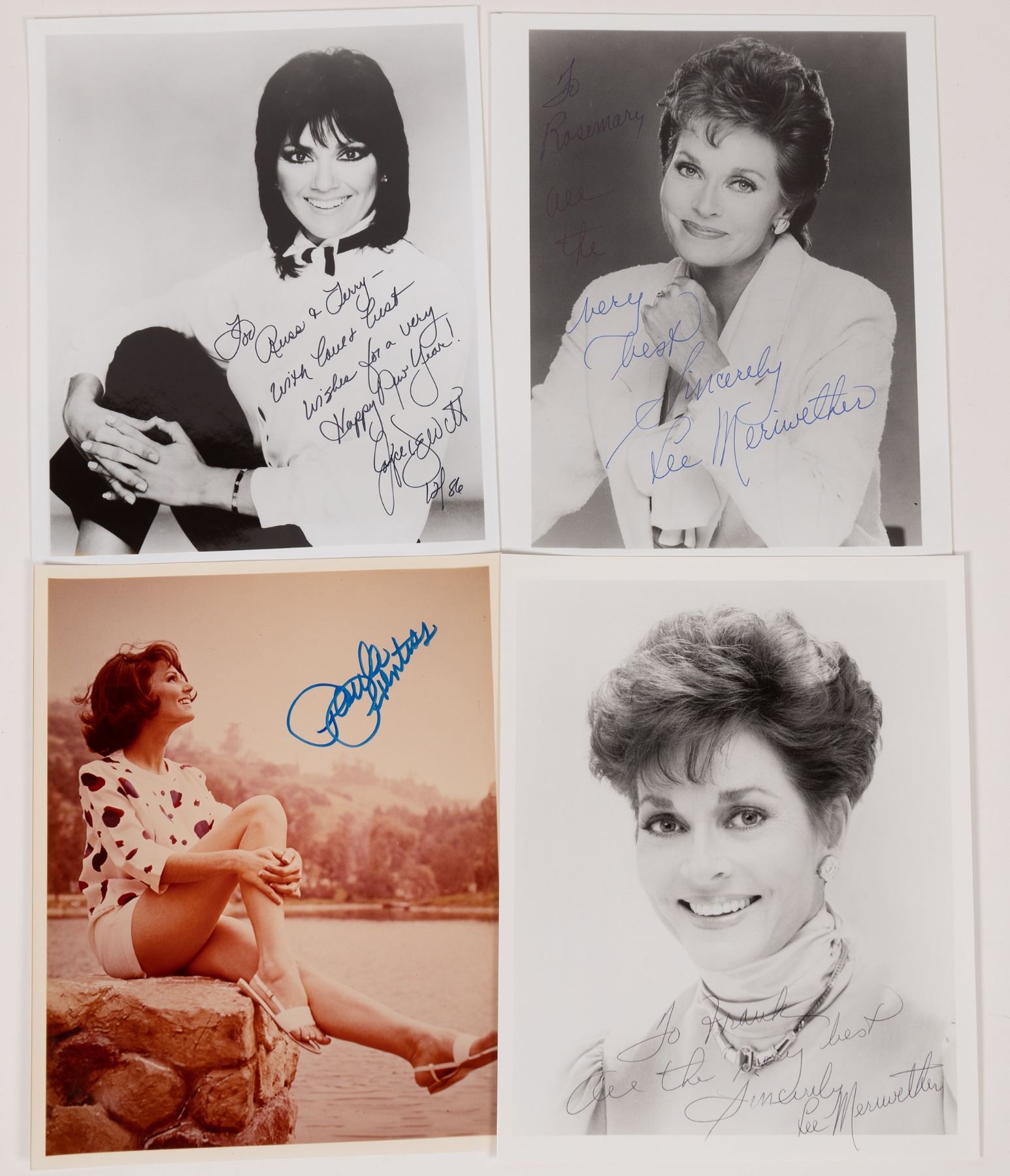 A group of signed and in most cases, inscribed photos of actresses from television. Included are Paula Prentiss (He & She), Joyce Dewitt (Three's Company) and two photos of Lee Meriwether (Barnaby Jones). Please see photos for more detail and condition. State:California City:Hollywood Date:1960's-1980's Provenance: Salvatore Falcone Collection