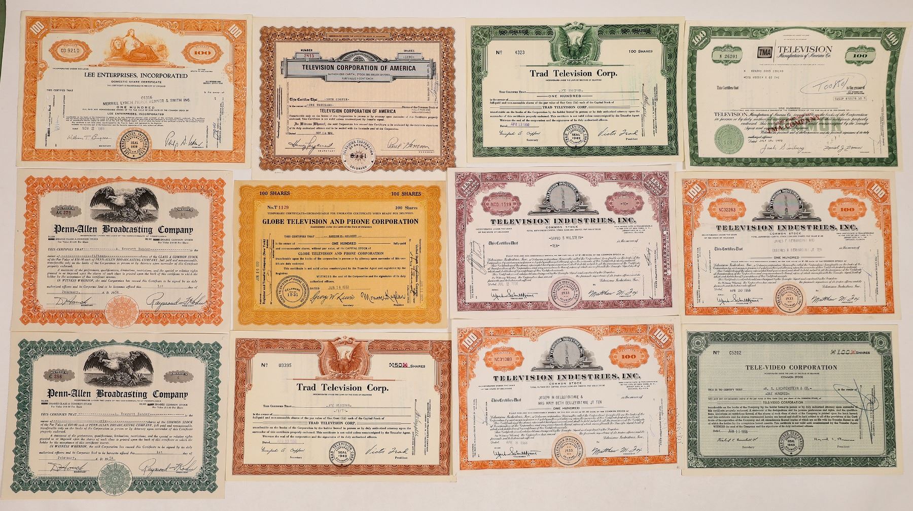A group of 16 stock certificates issued by television & radio manufacturing and supply companies. Included are Globe Television and Phone Corporation, Television Corporation of America, Tele-Video Corporation, Lee Enterprises Incorporated and many more. Some are cancelled, some are specimens. Please see photos for more detail and condition.