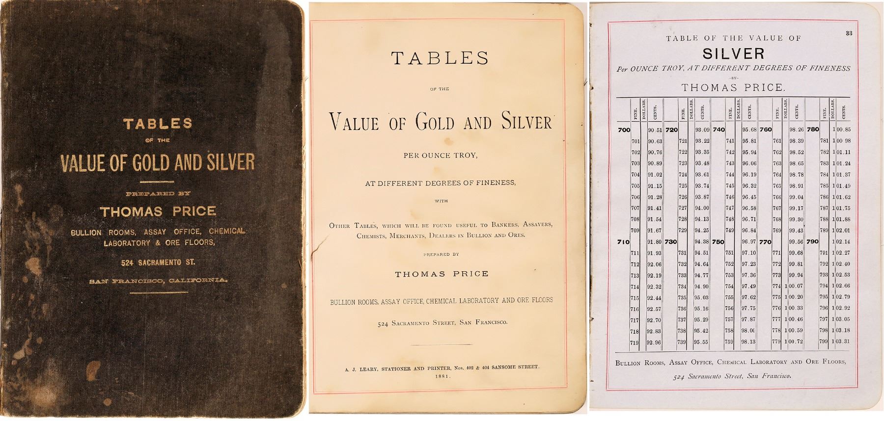 Book, Tables of the Value of Gold and Silver by Thomas Price. A.J. Leary printing 1881. 9 3/8 x7Ó, Only three copies exist. Price operation were considered the most extensive on the West Coast. Signed by Thomas Price 1883. Owned by Jos. R. Ryan and then H.B. Blueberry 1905. Front cover and first page have some water damage. Remainder of book is in good condition. Very Rare. San Francisco California 1881