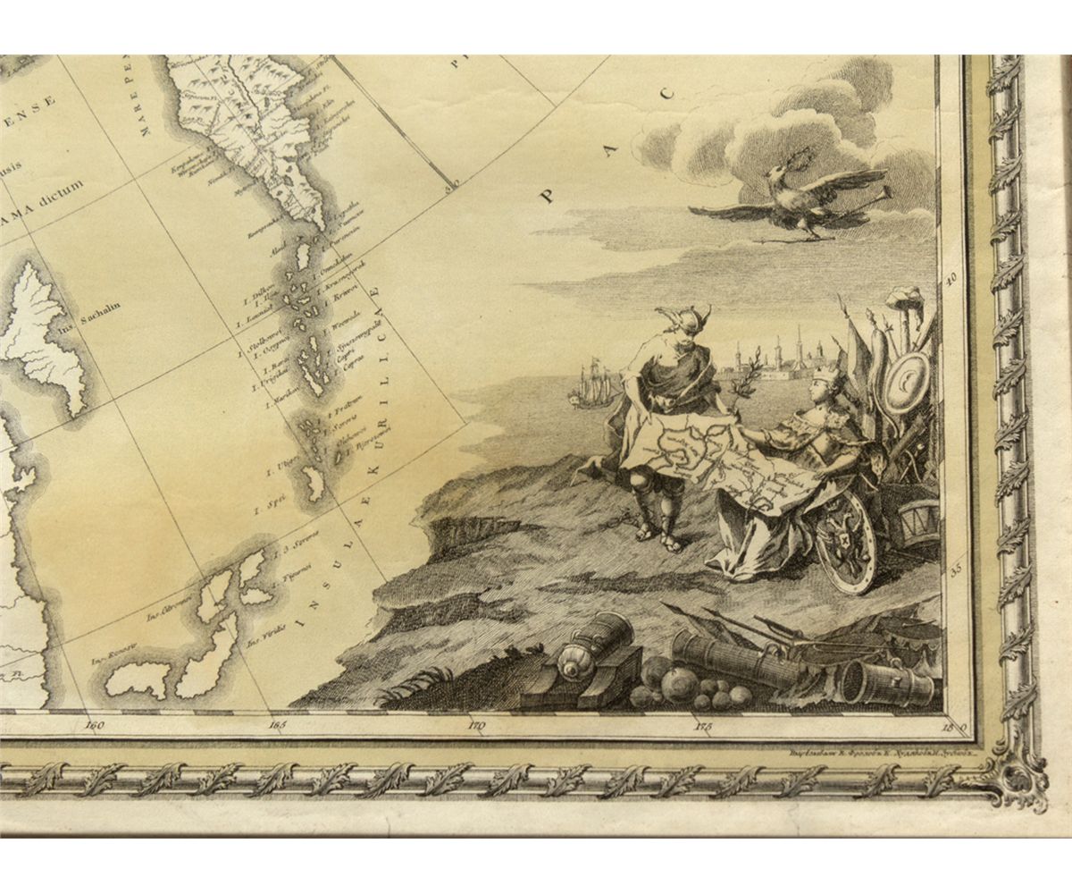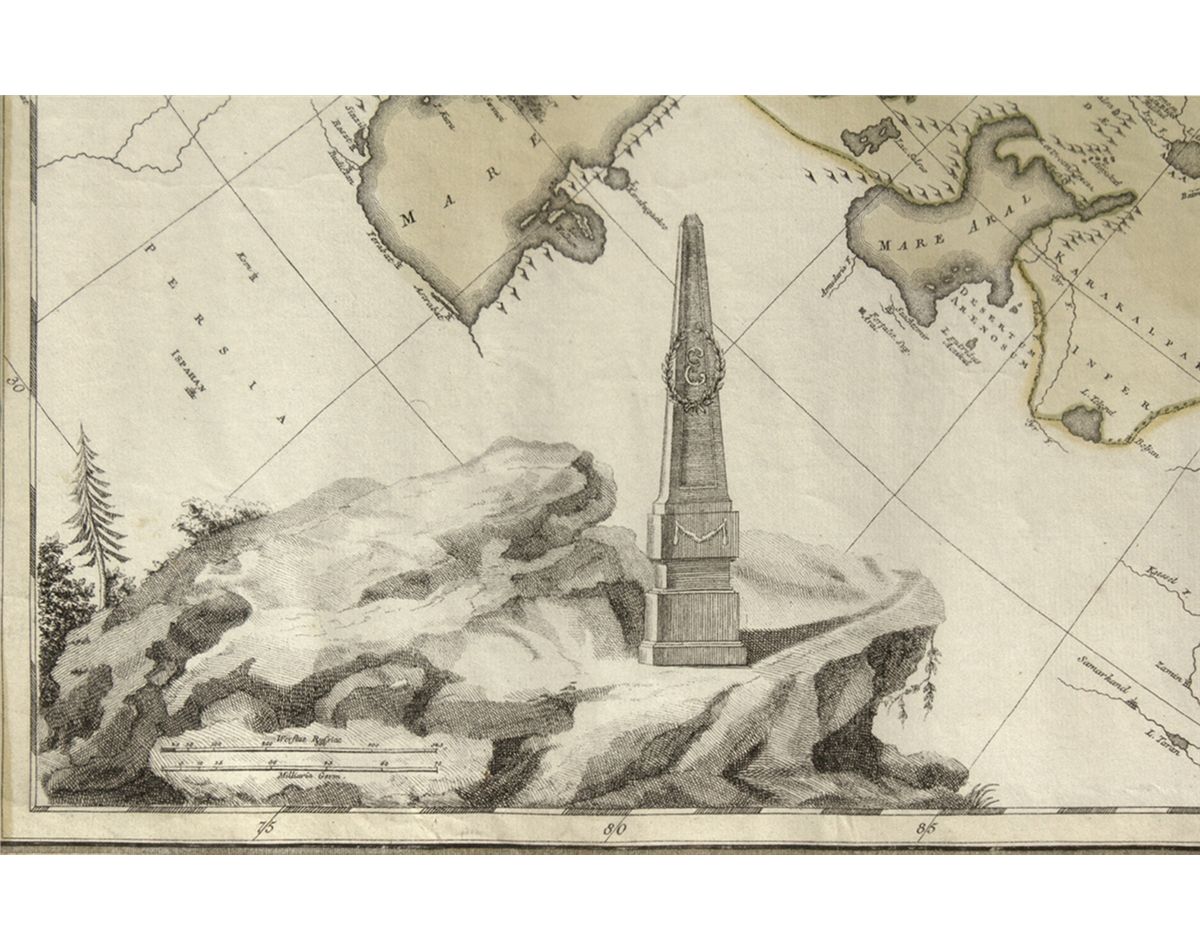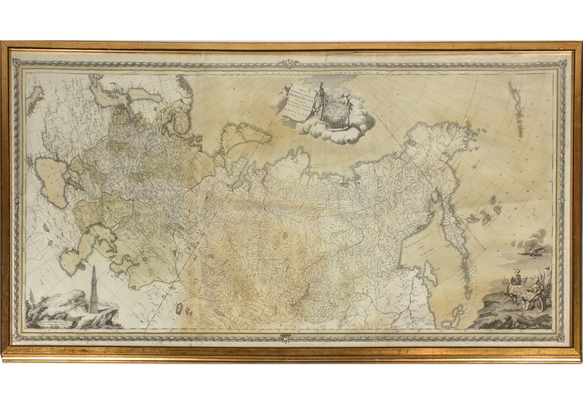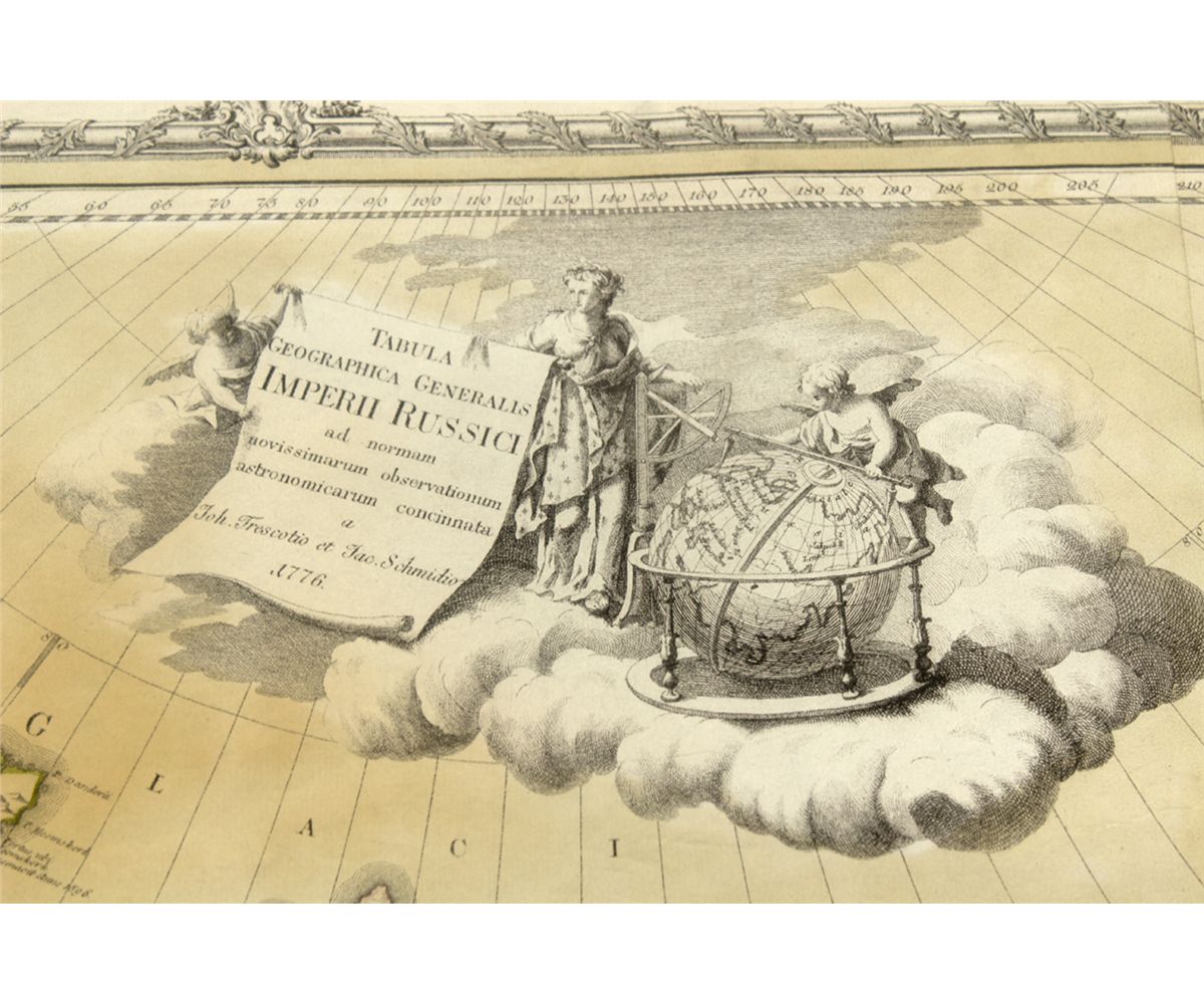 Johann Tresekt was a prolific map maker in the 1700’s. This map is based upon the work of Johann Treskot and Johann Schmidt. There work on a 23 sheet survey of Russia was completed in 1776 for the Imperial Academy of Sciences. It represented an important leap forward in the modern scientific mapping of Russia. From Lithuania and Poland in the west to the Pacific Ocean and the Aleutian Islands in the east, the Russian Empire sprawls across this map with great detail and refinement. 58 1/2 x 28 1/2". Tear in middle right. Two folds from atlas.