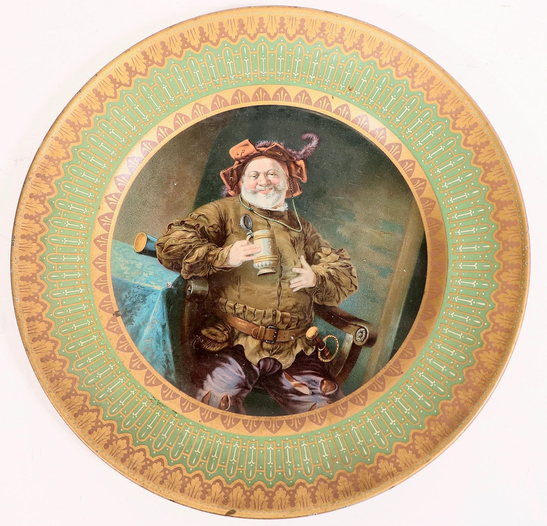 This beer tray is for single serving from "Tagg's/ Maennerchor/ Philadelphia". A maennerchor is a German social club specific to Pennsylvania. Our image is one of those German socialites.