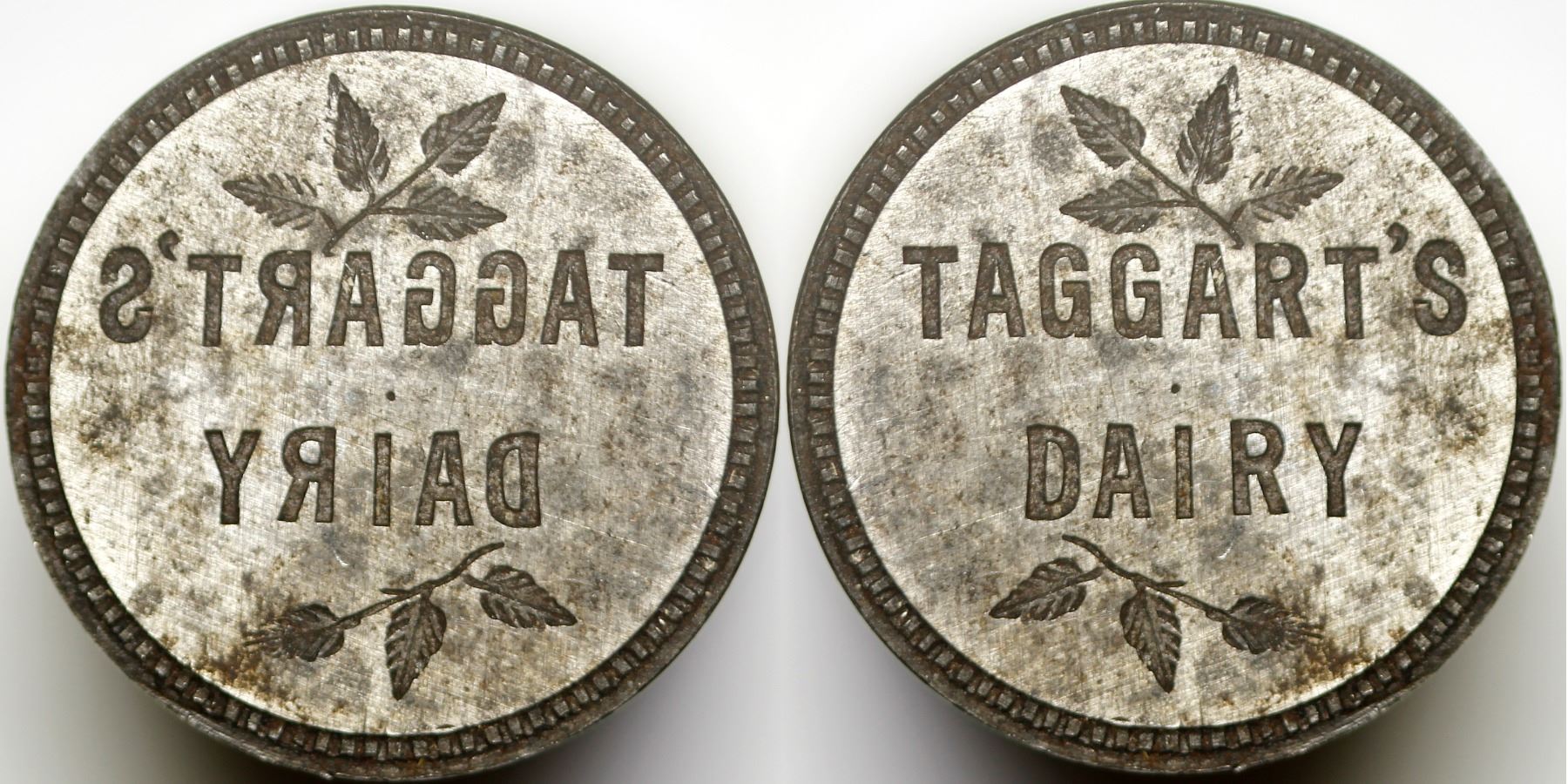 Token die: Taggart's / Dairy. 20 mm. NWT Mint Historical Die Collection (c 1903-1950).