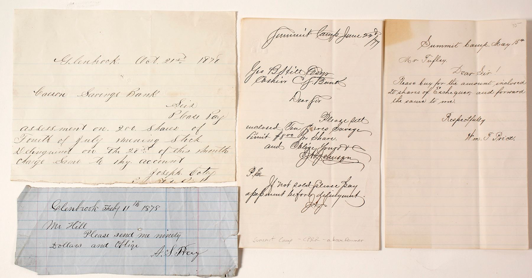 3 rare Mining Stock Documents 2 from Summit Bank, late 1900's & 1 letter from Glenbrook dated 1878 from Joseph Cotey. 1 has small hole in center and 1 has slight staining in upper left corner. 7.75 X 6" Date: 1878 Location: Tahoe Area, Nevada HWAC# 53346