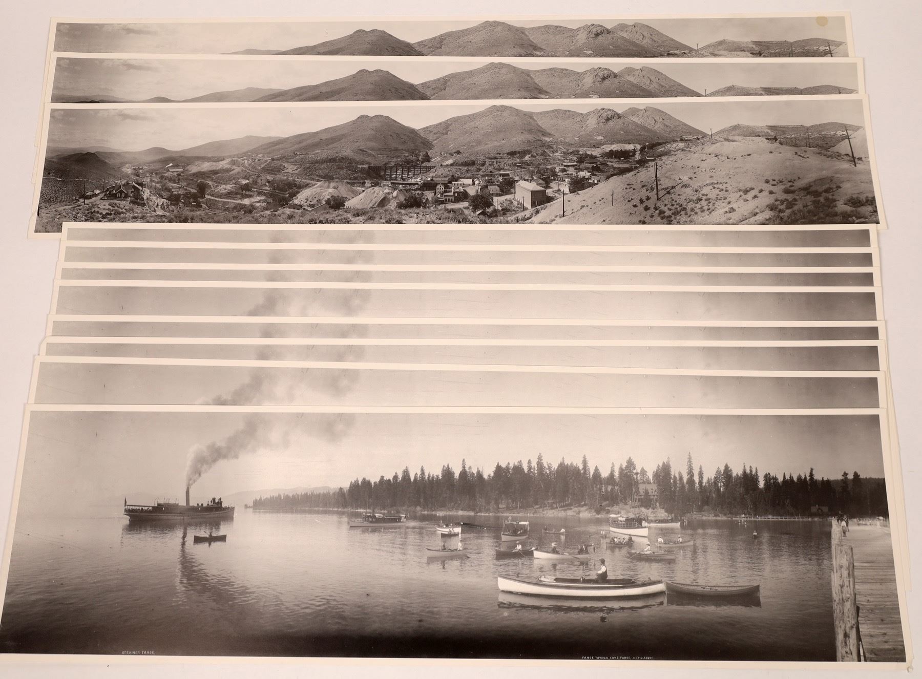 Consists of 11 panoramic photos. Eight are of boaters enjoying Lake Tahoe. These beautiful photos measure 9.5"x 32". Besides the canoes and rowboats, there is also one of the many tourist steamers that were and still are prevalent on the lake. There are also three panoramas of the Nevada mining town of Gold Hill. Photo measures 35"x 6". These are reproductions of earlier prints.