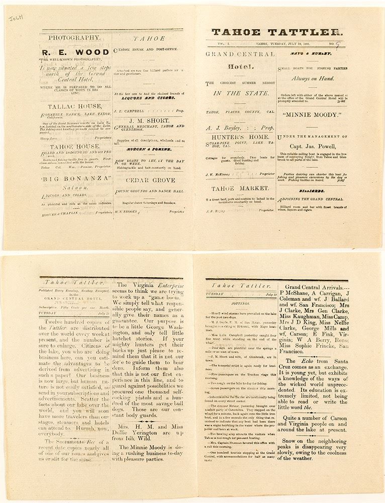 Great Tahoe collectible four page newspaper published every evening except Sunday. Published from the Grand Central Hotel, located in present day Tahoe City near the north shore of the Lake. Ads on the front page include Grand Central Hotel and Tahoe Market. Ads on the back include the Tahoe House and the Big Bonanza Saloon. This issue contains mostly social gossip including Grand Central arrivals, the booming business of the Minnie Moody and that quite a number of Carson and Virginia people are on and around the lake at present. Humorous content noting that the Virginia Enterprise has been accusing the paper regarding their "little hatchet stories". The Tattler notes that this is not their first experience in this line, and to guard against possibilities "we procured one thousand self-cocking pistols and a hundred of the most savage bull dogs. These are our constant body guards." Four pages. City: Tahoe City State: California Date: 1881 hwac# 35413