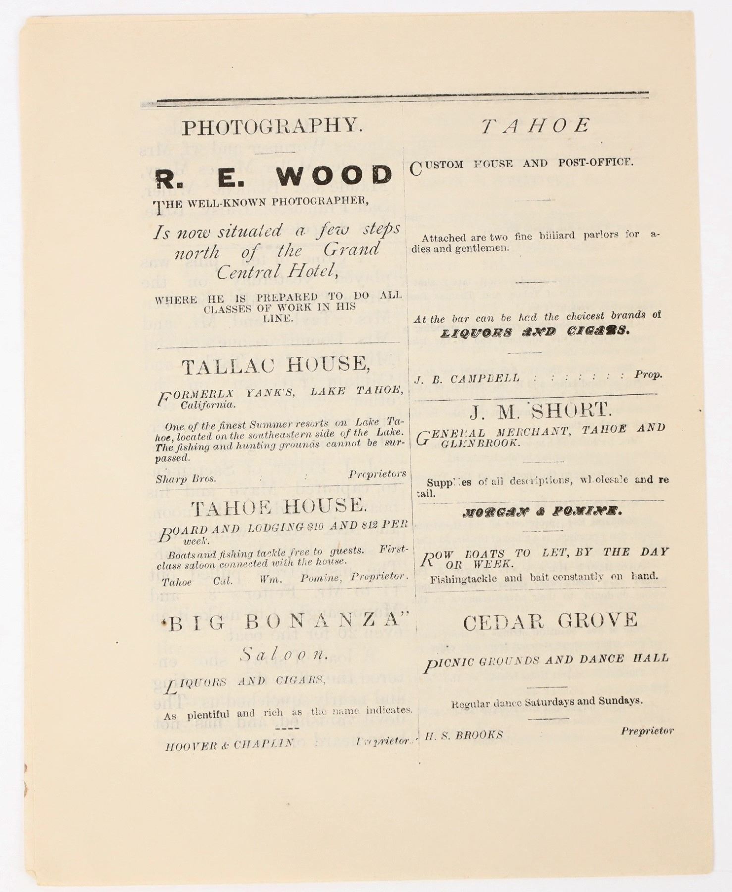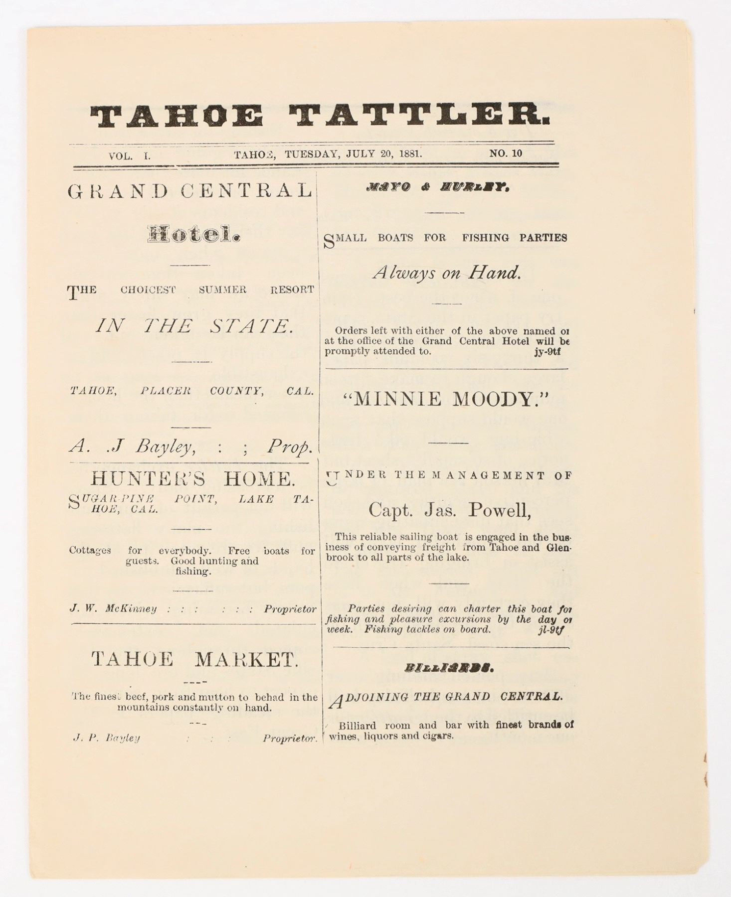 Vol. 1. No. 10. July 20, 1881. Mentions fishing, hunting, steamer excursions, and a bowling game at the Grand Central. Front and back have ads for hotels, saloons, and steamers. These papers have become nearly impossible to find. Short-lived mini-newspaper printed out of the Grand Central Hotel in Tahoe City. 6.75 x 5.25"