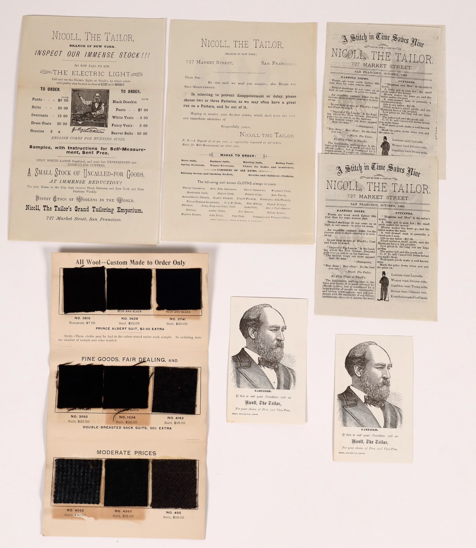 A samples catalog from the Cornell Tailoring Company of La Salle Street, Chicago for fall-winter 1893-4 with twelve swatches of fabrics. And an illustrated catalog and store cards from Nicoll The Tailor, 727 Market Street San Francisco, 1880.