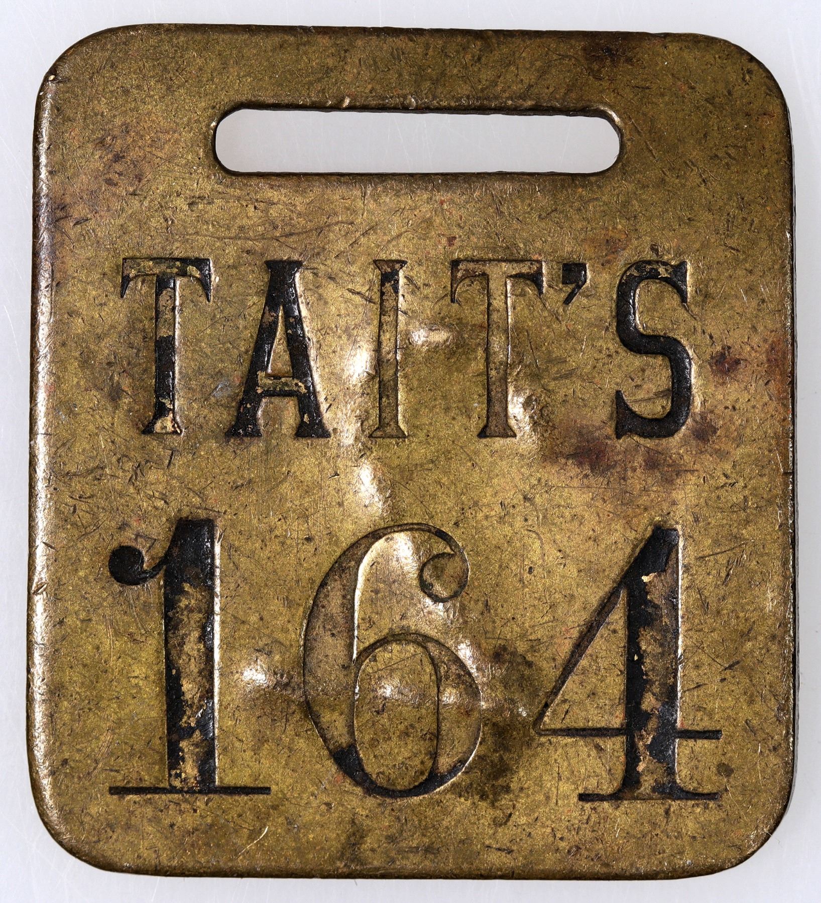 Brass tag (35 x 40 mm): obverse: Tait's / 164; reverse: "2". [San Francisco] [California]