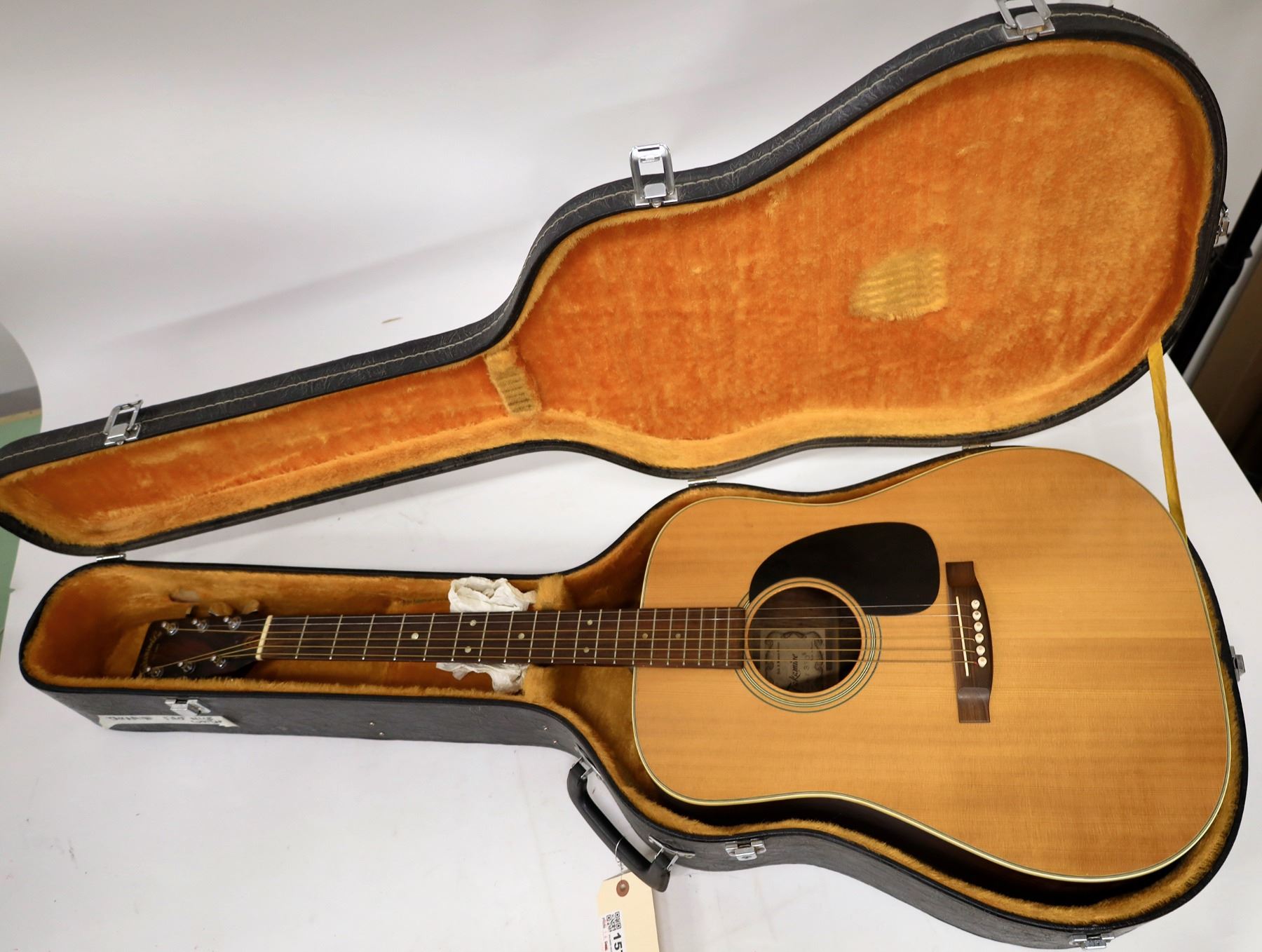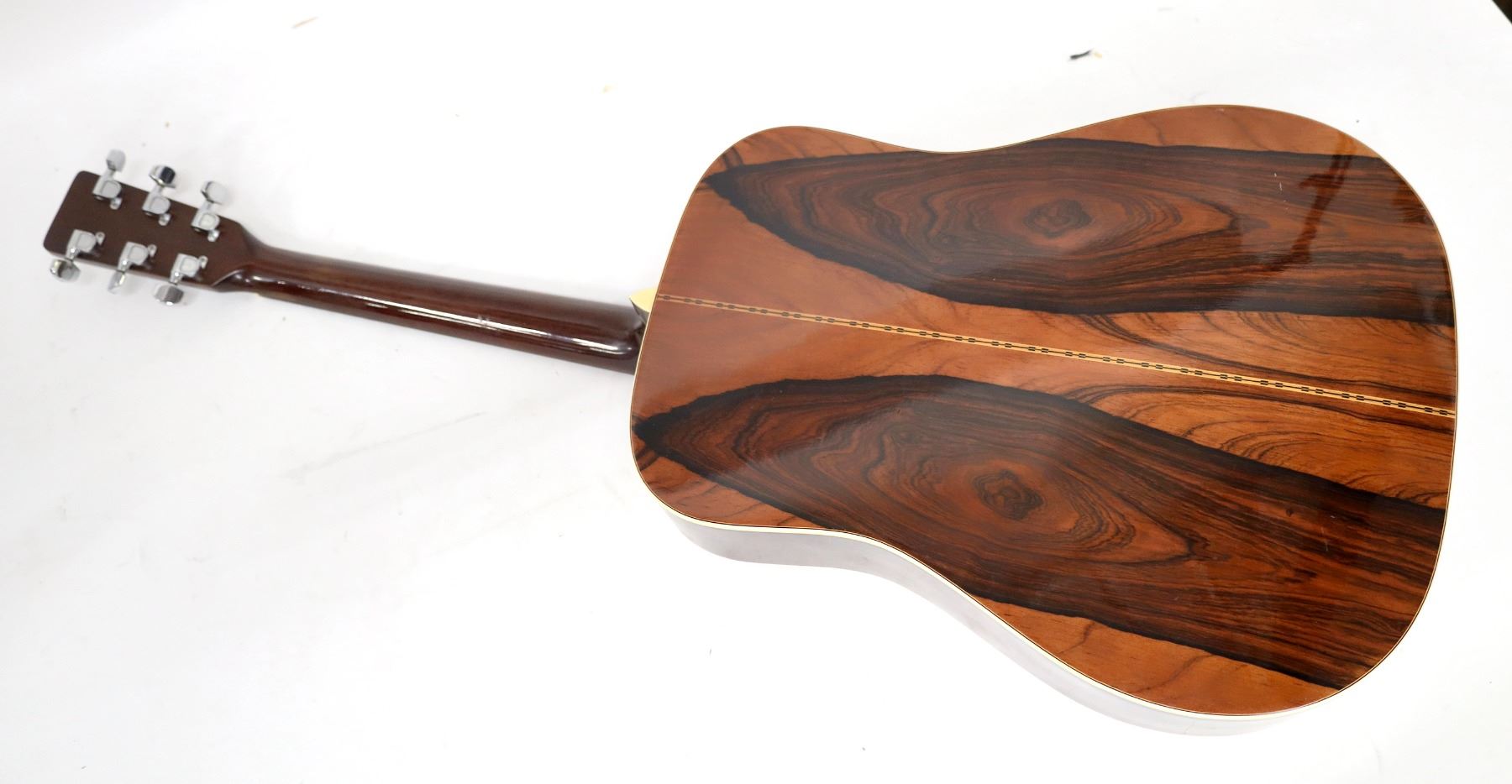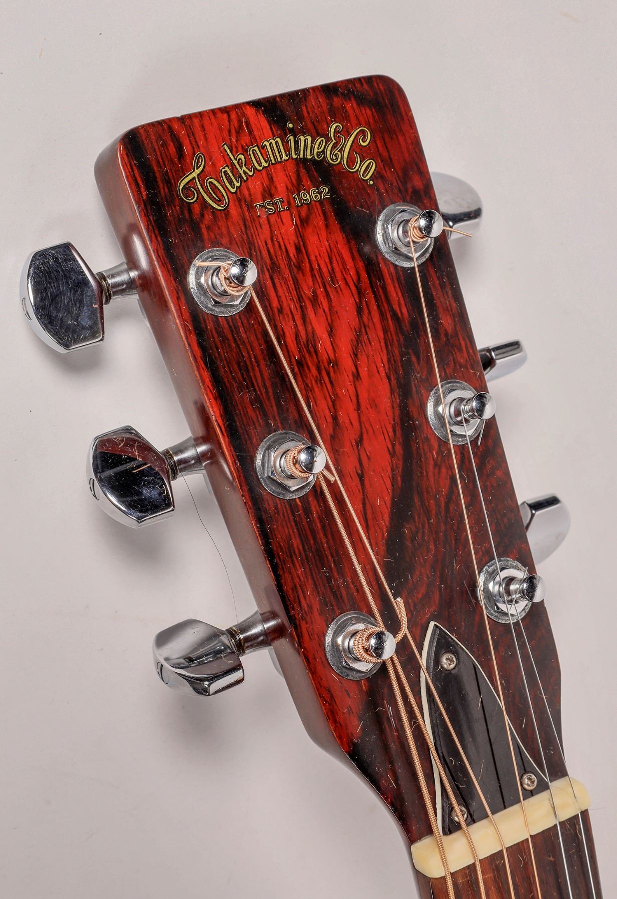 Takamini F370 acoustic guitar with hard case,45x18". No s/n. Brazilian rosewood veneer. Beautiful mirror imaged rear veneer. Missing small wood cover flap on lower head stock. Back of headstock has 6 small holes near tuners. See photos.