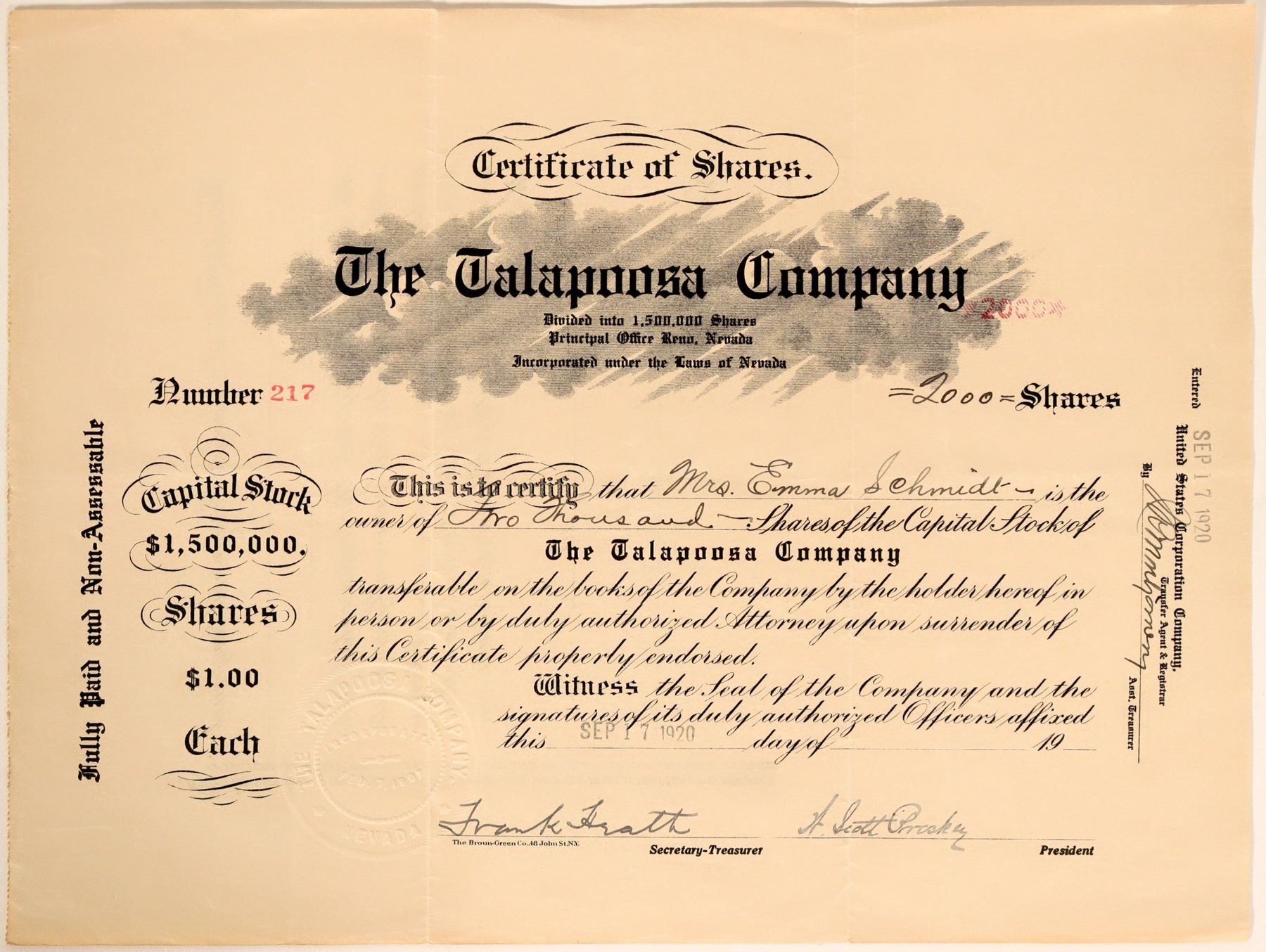 Later Comstock, but we not not see this very often. # 217 for 2000 shares to Mrs. Emma Schmidt. Autosigned by Prosky as president and Frank Heath. Principal office - Reno, Nevada. Does not appear in Reno papers until 1924. 15 miles northeast of Virginia City. One mile east of Ramsey. The Talapoosa showed production only in 1914 and 1940 [Couch and Carpenter]. Heath would sue Prosky and the Talapoosa in 1926 seemingly ending any mining.