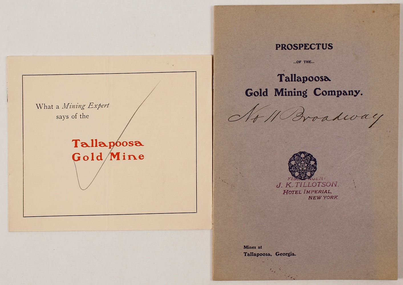 1) Prospectus. Stamped JK Tillotsen / Fiscal Agent / Hotel Imperial / New York. Tillotsen was also the vice president. c1902. 9 x 6". 24 pages. 12 full page photographs. Number of shares and price per share has been crossed out and new numbers entered. Some light discoloration on cover, but otherwise in excellent condition. 2) Five pages of "What a Mining Expert Says..." Large check mark on front cover and numbers on back. One vertical fold. The Tallapoosa Gold Mining Company was incorporated under the laws of New Jersey. Mines located at Tallapoosa, Ga. This company has purchased all of the property of the Royal Gold Mining Company to wit 607 acres in fee and in addition the mineral and mining right on 202 acres making 809 acres in all, The company owns a mill of forty 850 pound stamps. It is equipped with 8 concentrators and boilers, engines, Rand air compressor and other necessary machinery tools and supplies. (Al Adams Gold Rush Memorabilia Collection) Date: c1902 Location: Tallapoosa, Georgia HWAC# 57075