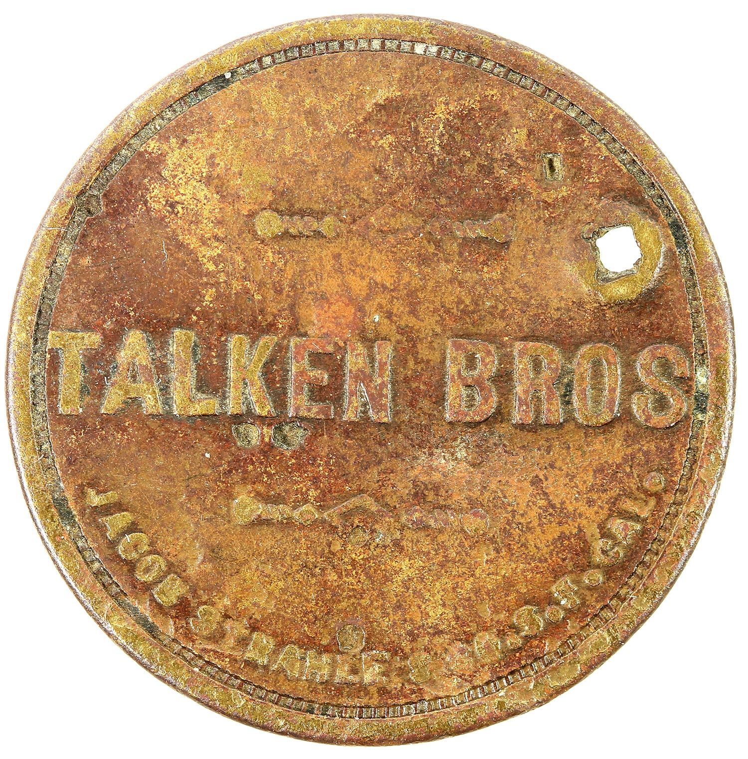 One of three tokens listed from Vallejo Junction: GOOD FOR / 1 / DRINK / AT / VALLEJO / JUNCTION / EXCHANGE // TALKEN BROS / JACOB STRAHLE & CO. S.F. CAL.; Br., rd., 24 mm, holed.
