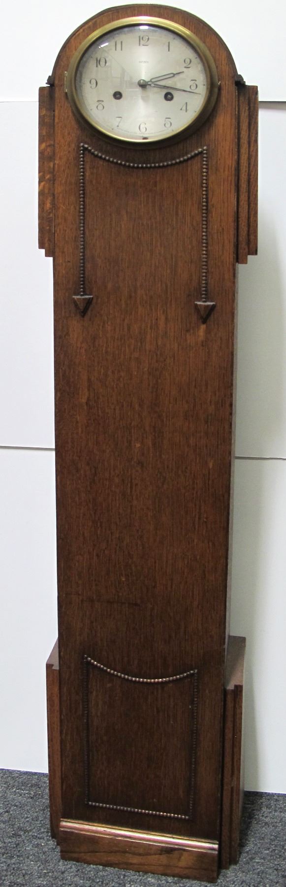 British made by the Enfield Clock Company, London. Wood constructed, oak finish exterior, tall and skinny with carved gingerbread, the tall and skinny lines reminiscent of Macintosh style. Overall height 48” overall with 9 ½” overall depth 6 ½”. Appears in excellent condition but we don't know if it's in working condition at the present time. State: City: Date: HWAC# 75233