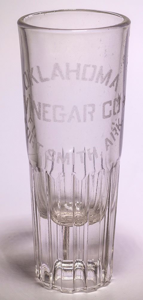 Clear glass, 5.5" tall, 2.25" diameter at the top, etched glass for "Oklahoma Vinegar Co. Fort Smith, Ark." Fluted base. Probably rare. Date: Location: Fort Smith, Arkansas HWAC# 51078
