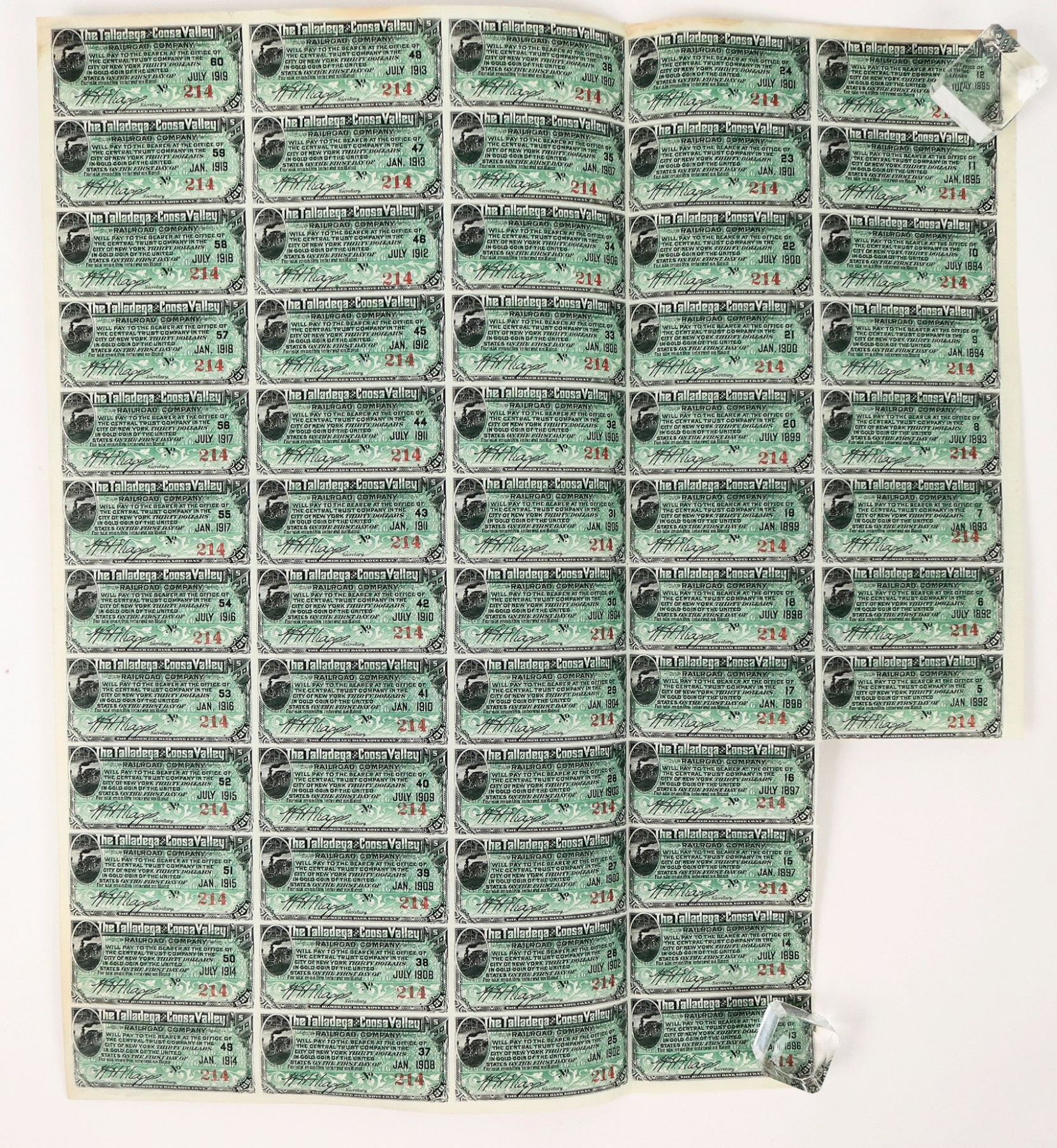 Uncancelled 1889 Talladega and Coosa RR bond, most coupons attached. Upper and lower stains, please inspect. Chartered on December 9, 1883. Main line completed in 1887. Gauge changed to standard on July 15, 1889. Main line: Talladega, AL to Pell City, AL, 26.9 miles; branch: Ragan to Talladega Iron & Steel Co.’s ore bed, 2.7 miles.