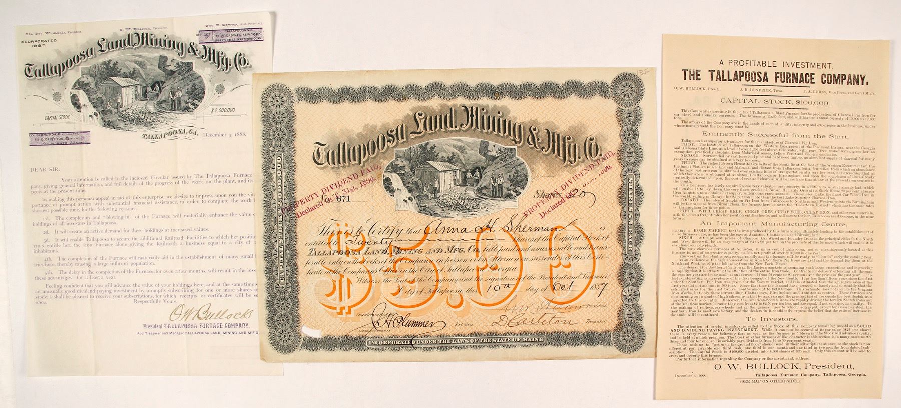 1) Stick issued to Anna H Sherman in 1887. Number 671 for 20 shares. Signed by JH PLummer asst. secretary, D Carleton treasurer and (?) president. Large tear at seal, pin holes and edge issues. Stamped "Property Dividend Paid, Declared Oct. 31st, 1890." Mining Vignette. 2) Advertising for the Tallapoosa Furnace Company. Letter on Tallapoosa Nadf, Mining, and Mfg. Co. letterhead. Same vignette as the stock certificate. obviously closely tied together. Date December 3, 1888. Signed by OW Bullocks who was president of the Furnace Company and secretary/treasurer of the Mining and Land Company. 3) Small letter side broadside of advertising for investors. Back has a map of the area around Tallapoosa. Letter and broadside are in very nice condition.