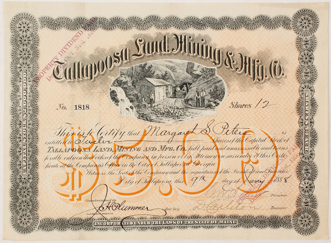 Issued to Margaret S Peters in 1888. Number 1818 for 12 shares. Signed by JH PLummer asst. secretary and D Carleton president. Mining Vignette. Condition: A few pinholes. Two corners dog eared. No other edge issues, staining, rips or tears. Stamped "Property Dividend Paid, Declared Oct. 31st, 1890." Although this company was incorporated to take advantage fo the mining in the area, its real importance lie with grapes! "One of the numerous northern visitors to the county was Ralph L. Spencer, a Connecticut land speculator and entrepreneur who established the Tallapoosa Land Mining and Manufacturing Company in 1887. Spencer organized Tallapoosa's first municipal electric light company, water works company, and athletic association. He also was a prime investor in a glassware factory in town. When mining waned, Spencer embarked on what may have been his most interesting endeavor - the establishment of a planned community for the purpose of wine making. He invited some of Pennsylvania's Hungarian immigrants to leave their mining jobs and relocate to 2,000 acres near Tallapoosa, where they could produce wine. Led by their priest, Father Francis Janishek, 200 families accepted Spencer's invitation. They planted vineyards and established wineries in the community they named 'Budapest'." [New Georgia Encyclopedia online]