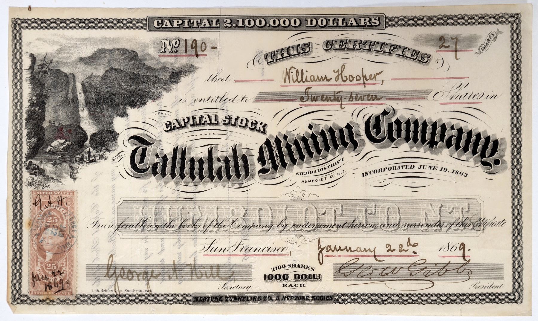 Sierra District, Humboldt Co., N. T. (printed under title). "Neptune Tunneling Co. & Neptune Series" (printed bottom center). Incorporated June 19, 1863. Definitely a territorial stock, although it was issued 5 years after Nevada had become a state. # 190, issued for 27 shares to Michael Hooper on January 22, 1869 in San Francisco. Signed by president Geo. Gibbs and secretary George A. Hill. Not cancelled. Black border and print. Beautiful vignette of prospectors next to a waterfall. Not a typical Nevada desert scene and quite unique. "Humboldt Co. N. T." underprint. Lith. Britton & Co., San Francisco. 25 cent US IR stamp at lower left. Folds, pinholes, bent corner. The Tallulah mine was a combination of the four mines on Neptune Hill. Early reports of this area were quite fantastic! Early reports from newspapers on the mine (2 1/2 pages) and district (1 page) are included.