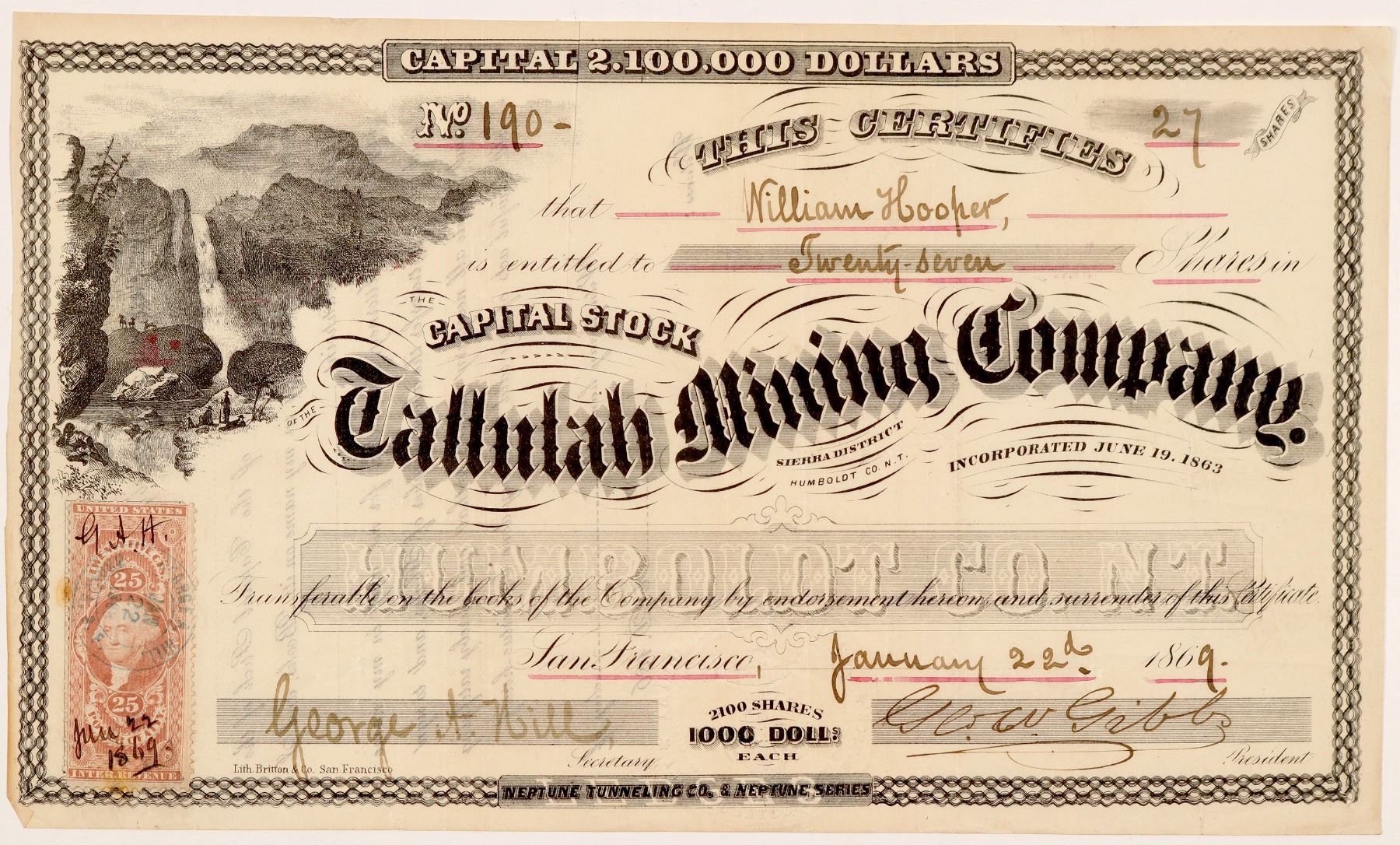 Sierra District, Humboldt Co., N.T. (printed under title). "Neptune Tunneling Co. & Neptune Series" (printed bottom center). Inc. June 19, 1863. No. 190, issued for 27 shares to Michael Hooper on Jan. 22nd, 1869 in San Francisco. Signed by president Geo. Gibbs and secretary George A. Hill. Not cancelled. Black border and print. Beautiful vignette of prospectors next to a waterfall. "Humboldt Co. NT" underprint. Lith. Britton * Co., San Francisco. Definitely a territorial stock form issued 5 years after Nevada had become a state. 25 cent US IR stamp at lower left. 5.5 x 9.5" Folds, pinholes, ben corner. 1864 reports from San Francisco News letter and The Pacific Mining Journal state that the Great Basin Mining Company was working two extensions on the Tallulah Mine. Reports in that publication also state that the Tallulah is a great prospect. Newspaper articles on CDNC for the company exist up until 1872. The 1869 Langley SF directory lists George W. Gibbs as a jobber and importer of iron and steel. Michael Hooper is not listed. Ken Prag Collection