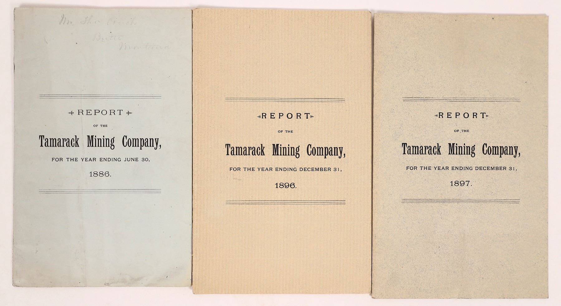 3 reports from Tamarack Mining, 1886, 1896, 1897. Copper mining assets and liabilities, discussion of yields, machinery etc. Vertical creases. Michigan