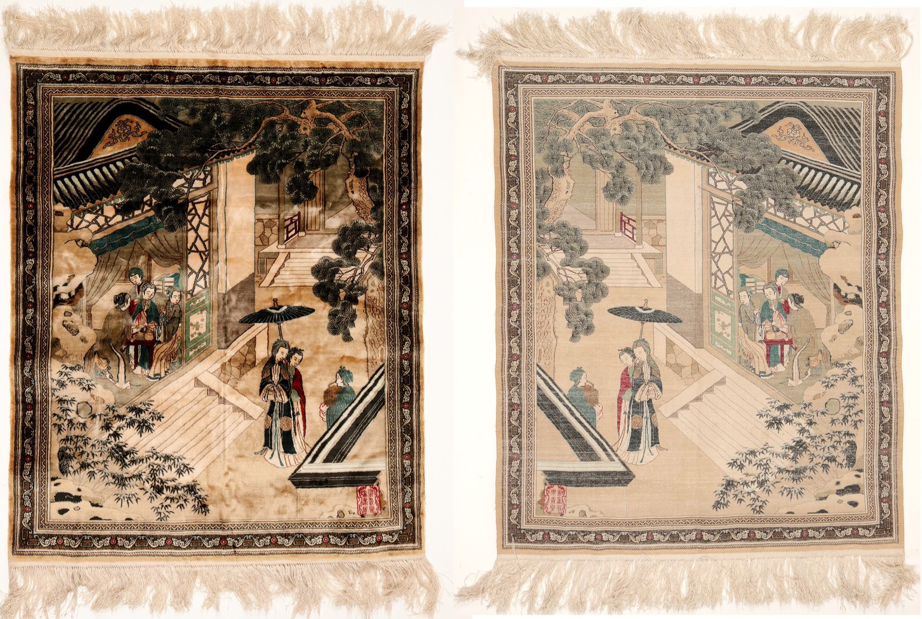 Very beautiful, and believed to be, antique " Chinese Silk Embroidered Wall Tapestry" . This fine piece of work depicts, a royal person walking with her favorite lady. While the other" ladies in waiting" look on while having tea. It is from China , and may be 1900-1920's, or earlier. It is made of silk and hand knotted. It has a beautiful smooth texture, and would grace any wall, in an exceptional manner. The size is 30 7/8" tall x 25" wide, not counting the tassels. Perfect condition, and high quality. (RH).
