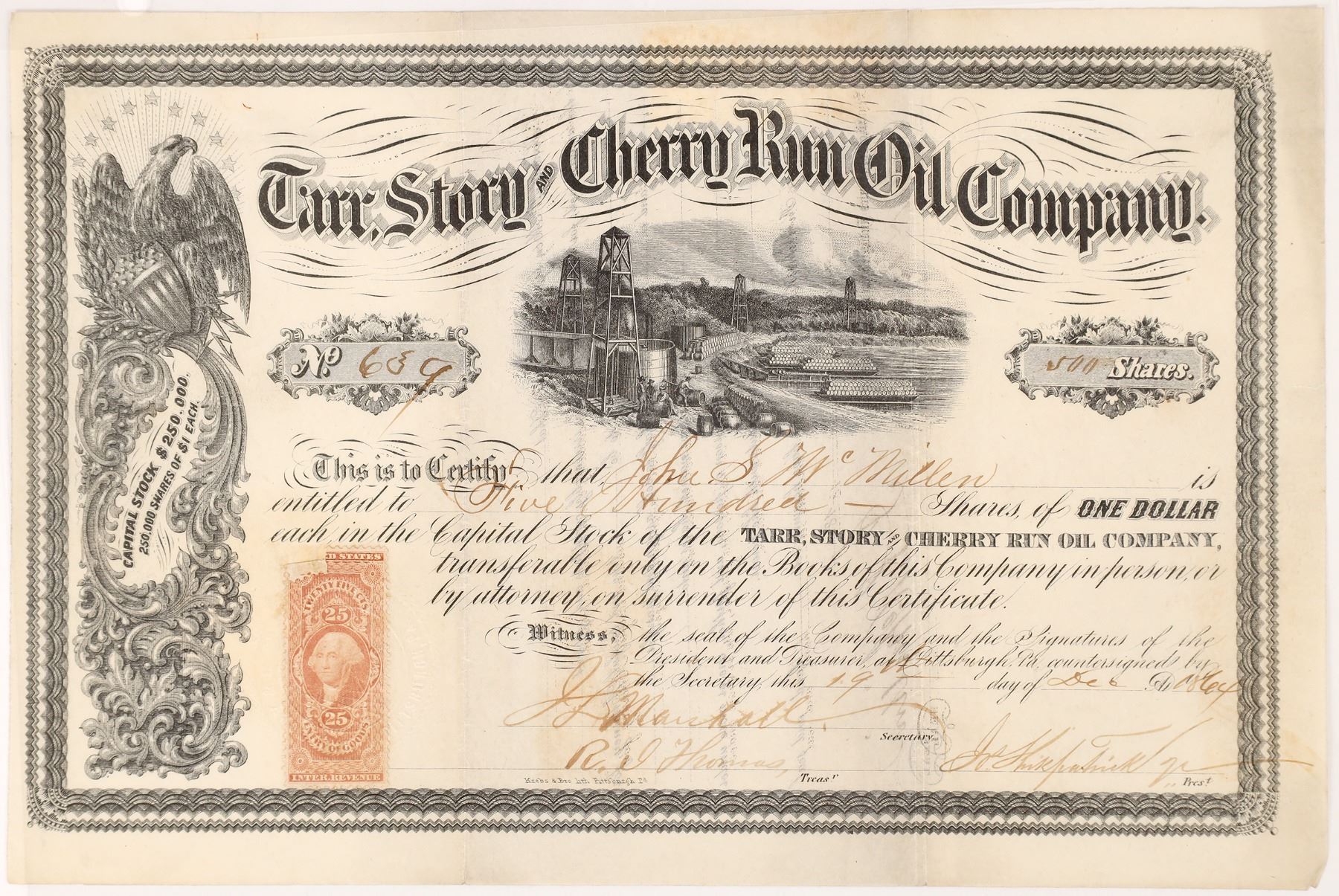 No. 639, issued for 500 shares to John S. McMillen in Pittsburgh in 1864. Signed by vice president Kirkpatrick ad treasurer Thomas. Not cancelled. Black border and print with oil field vignette (center) and eagle vignette (left border). Printed by Krebs & Bro., Pittsburgh. 25 cent US IR Entry of Goods stamp attached on the bottom left. 7.25 x 10.5" Folds. No additional information located. Venango County Pennsylvania Ken Prag Collection