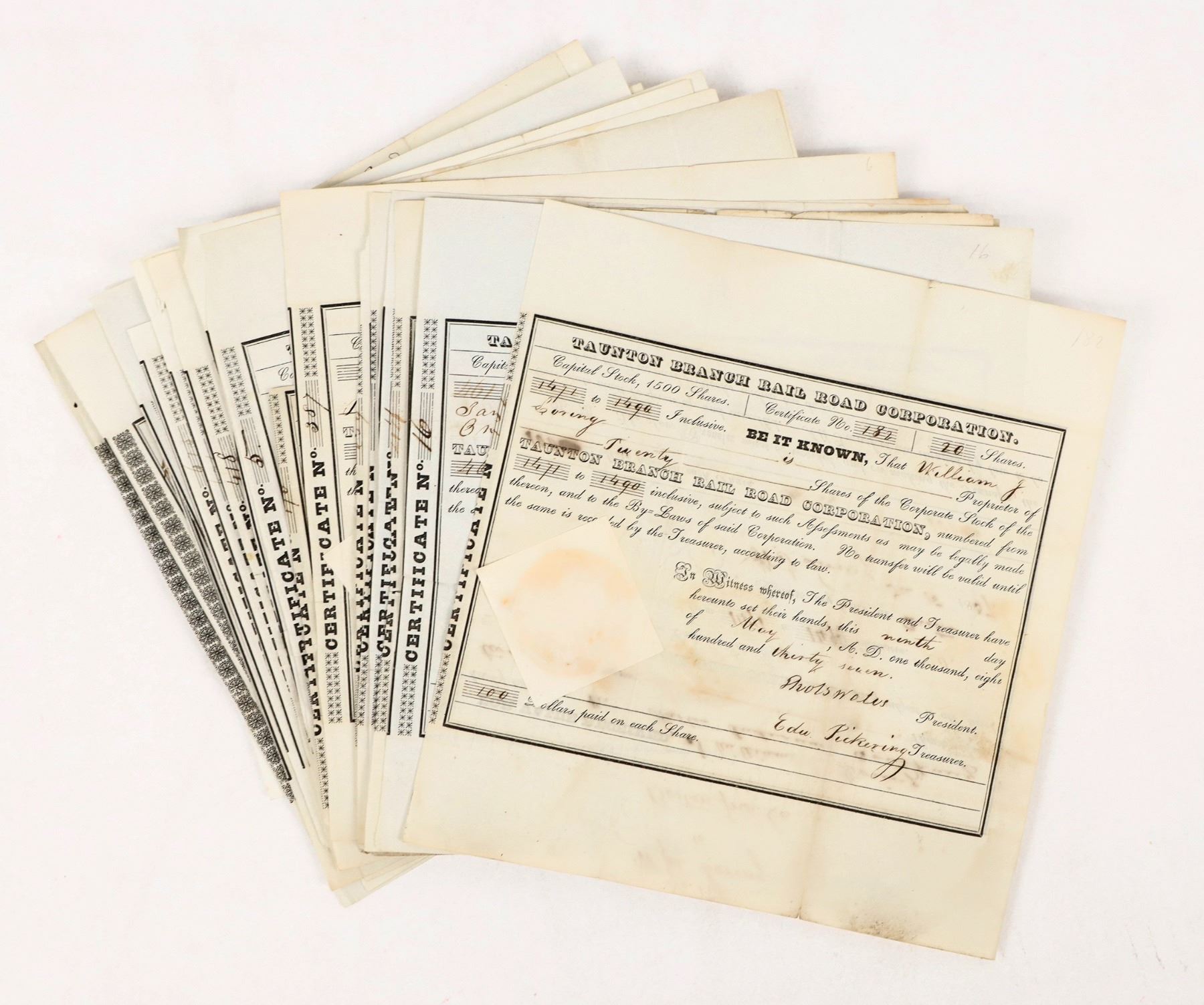 Lot of 20 stocks issued in the 1830s and 40s. Some are pen cancelled. One of the earliest railroads in Massachusetts. Please see photo for details.