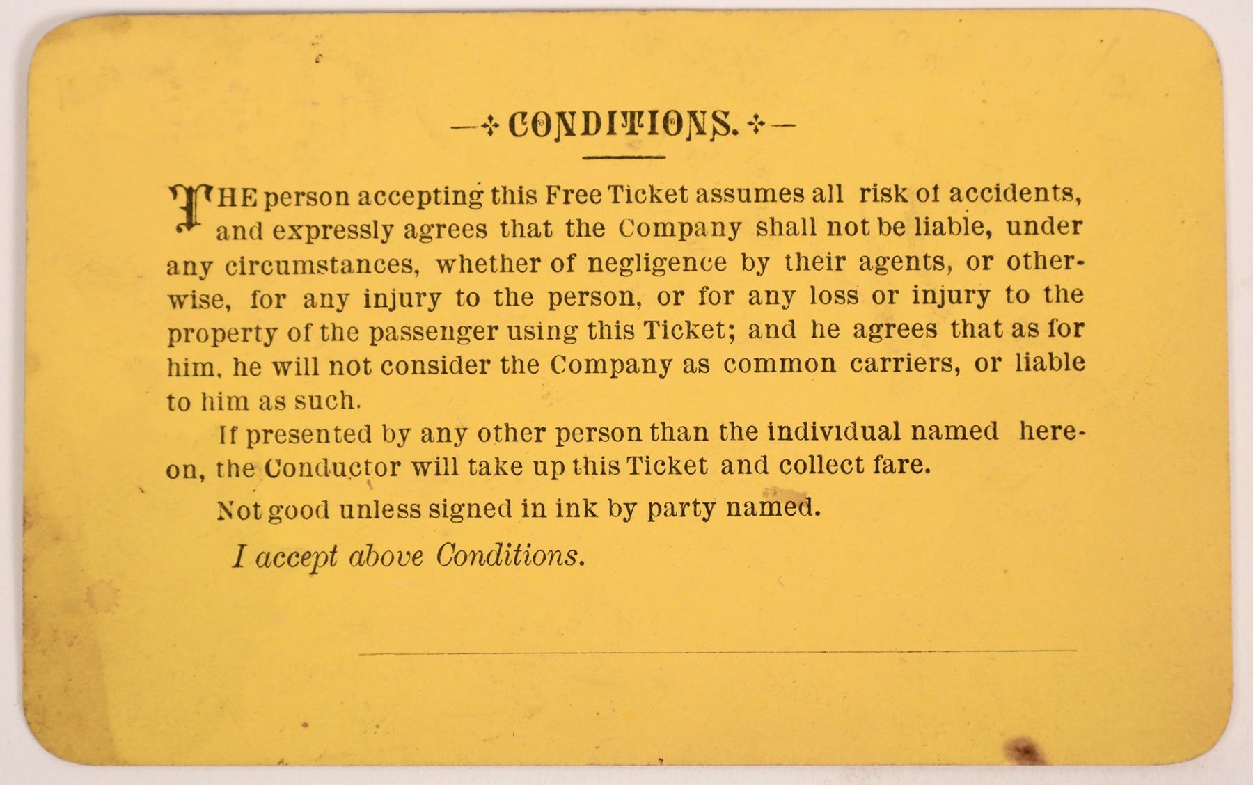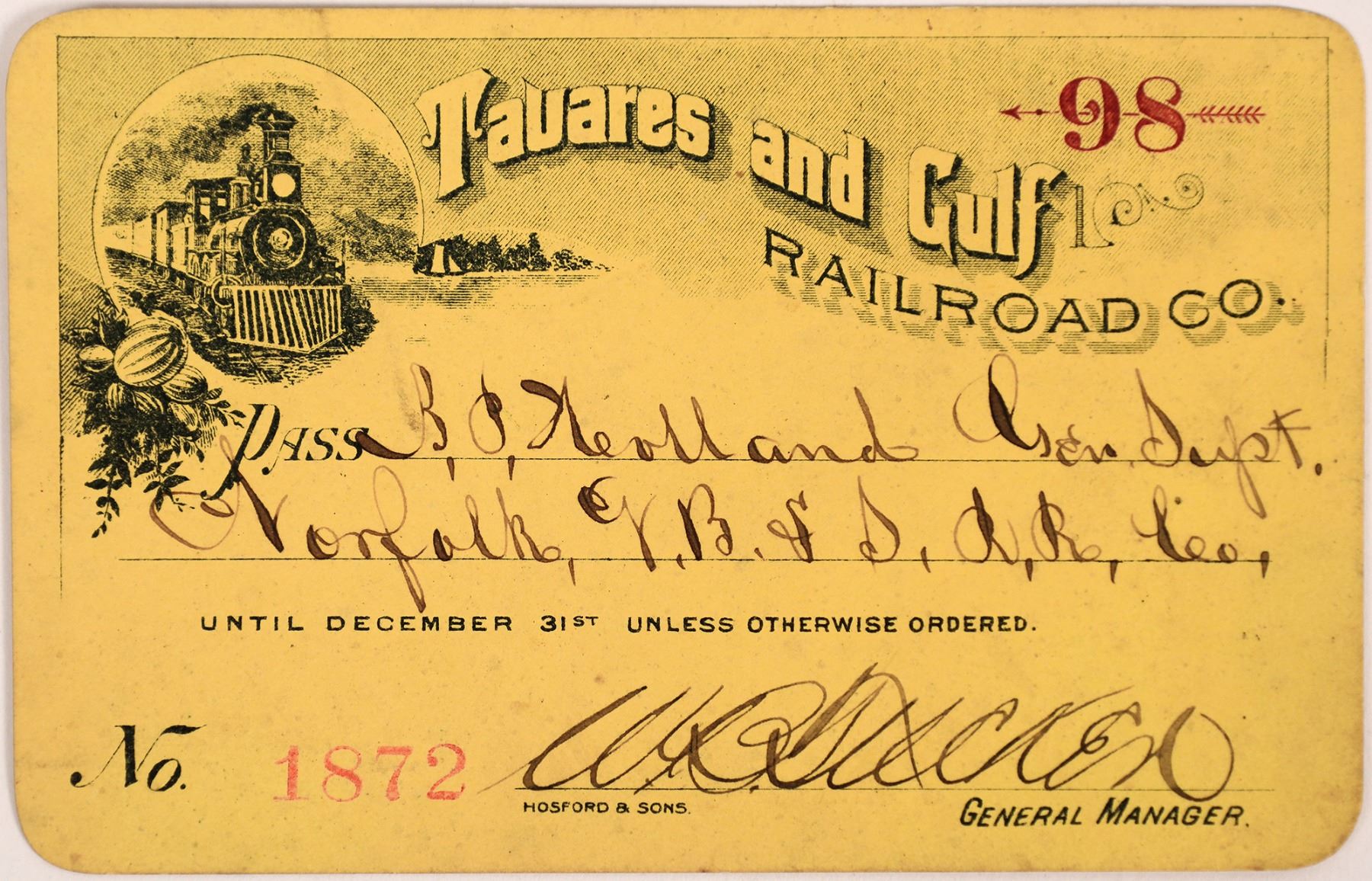 Pass no. 1872, issued for 1898 to BO Holland, general superintendent of Norfolk, GB&S Railroad Company. Signed by the general manager Tucker. Black print and locomotive vignette printed on yellow cardstock by Hosford & Sons. Light wear. Known as the "Tug & Grunt," this railroad serviced Florida's produce industry from Tavares to Montverde and Clermont.