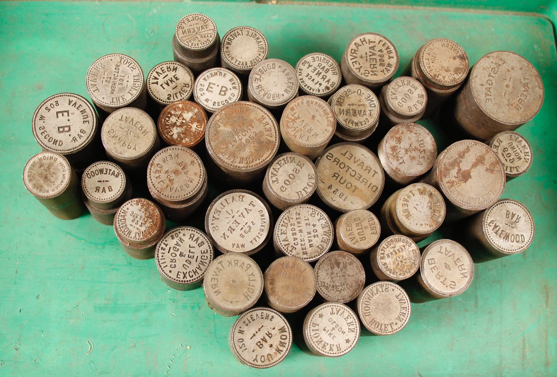 Group of about 50 or more obverse dies from Taverns or bars (no saloon pieces) from an unknown Seattle area die sinker, c 1903-1950. This is another fun "bonanza" group for the token collectors, as you can look up these merchants int the Washington maverick list, or the surrounding states. None of these are self-identified with city or state. State: Washington City: Date: HWAC# 84823