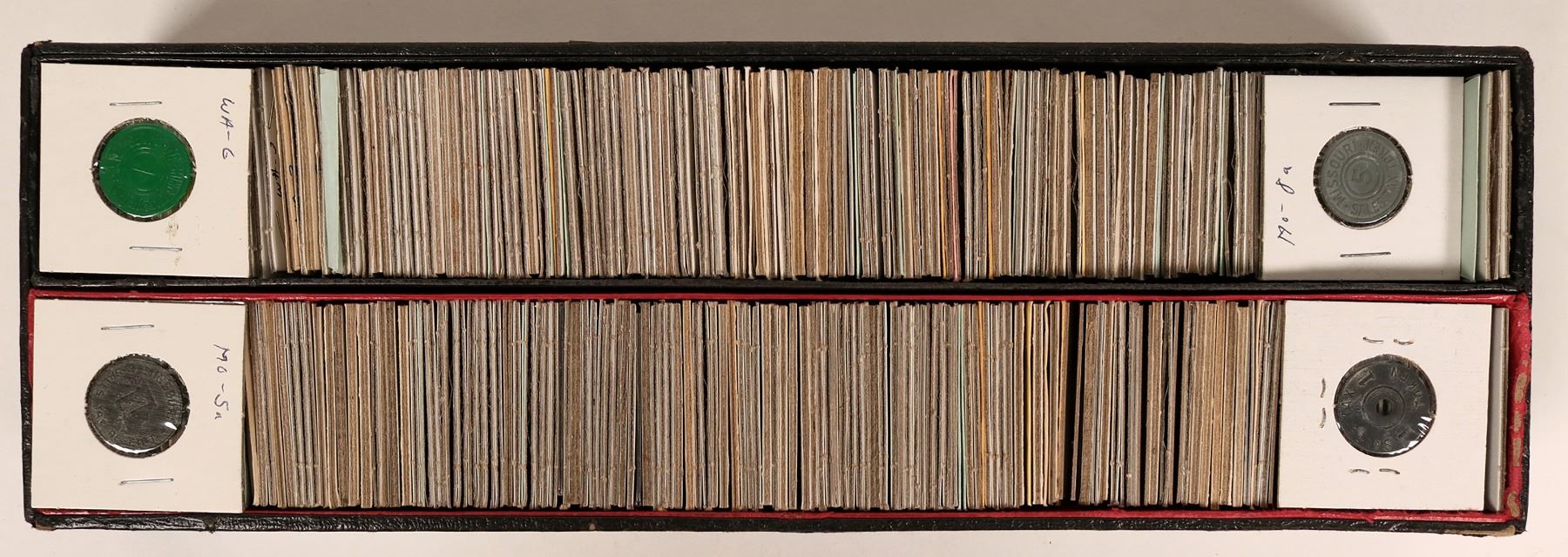 Double row box 14 inches long full of tax tokens from across the country; Alabama-Washington. Approximately 200-300 pieces.