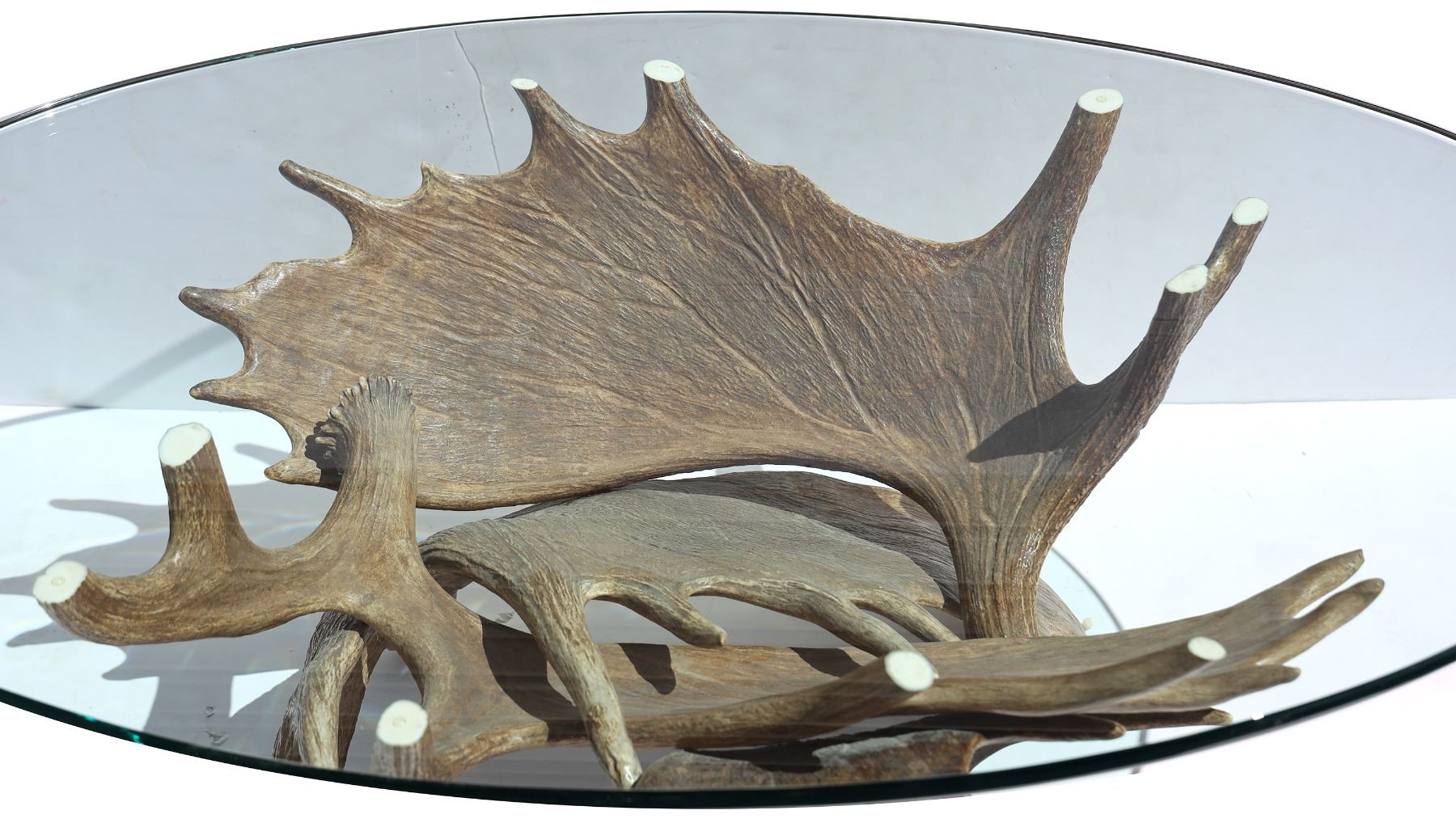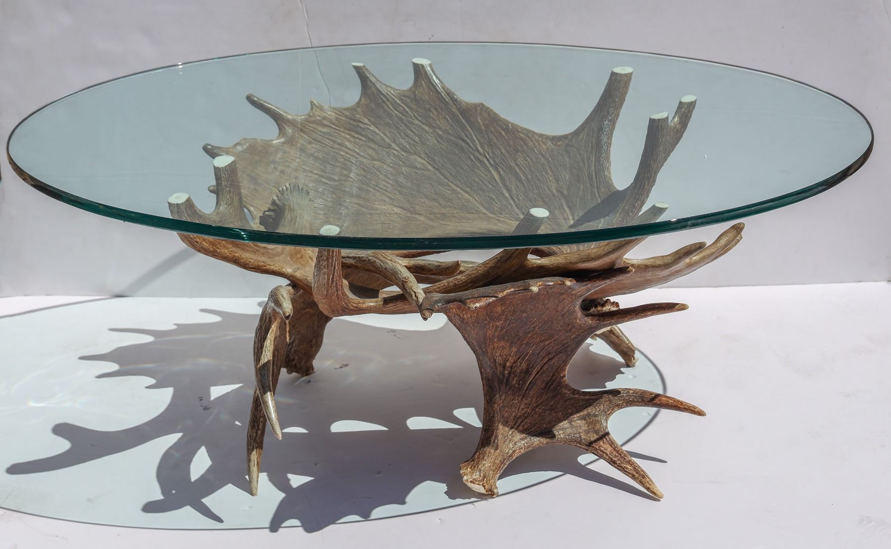 Unique Creation of functional art. 18" tall x 4' 4" long, 2' 7.5" wide with a clear glass top. A choice modern western Americana coffee table