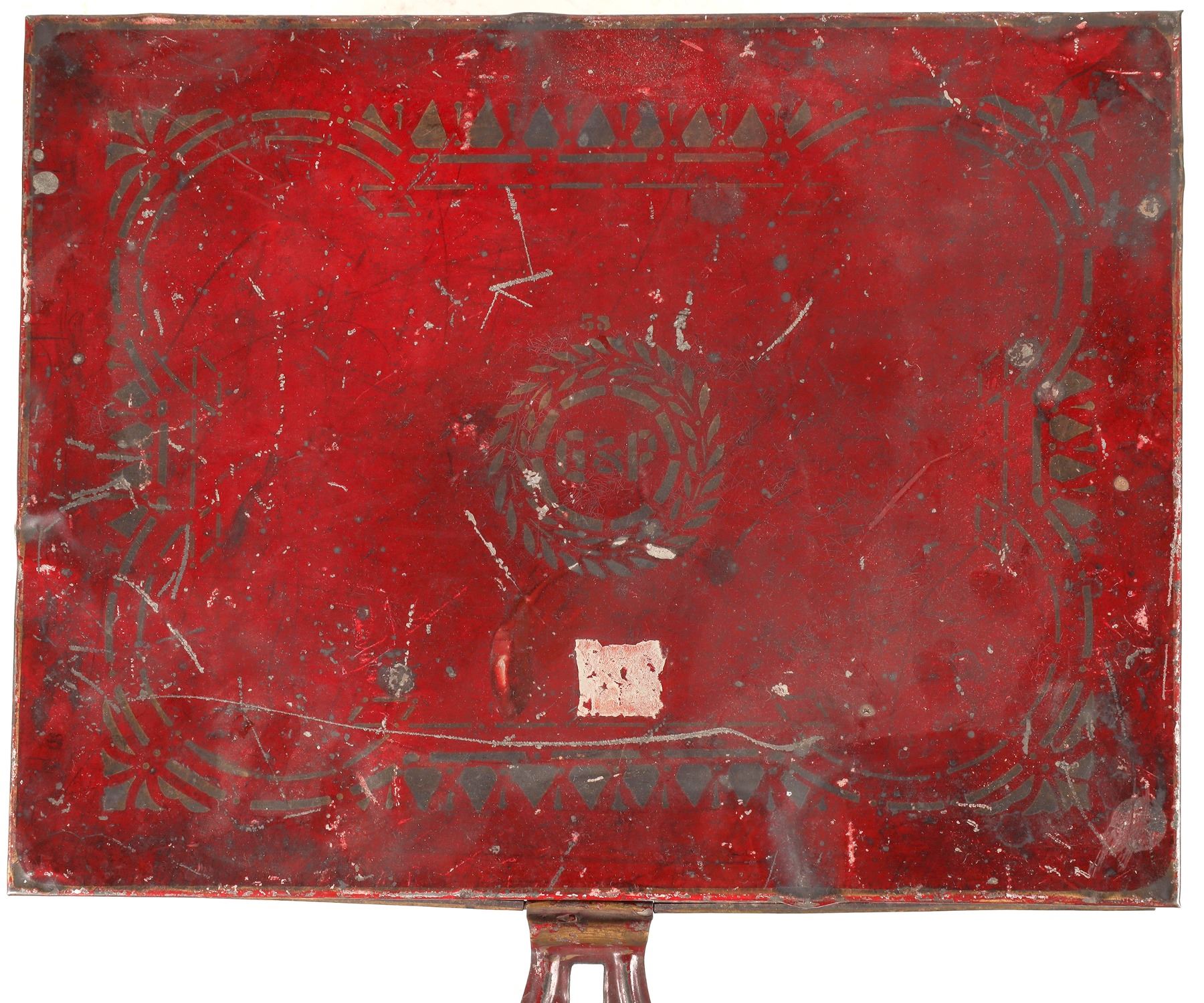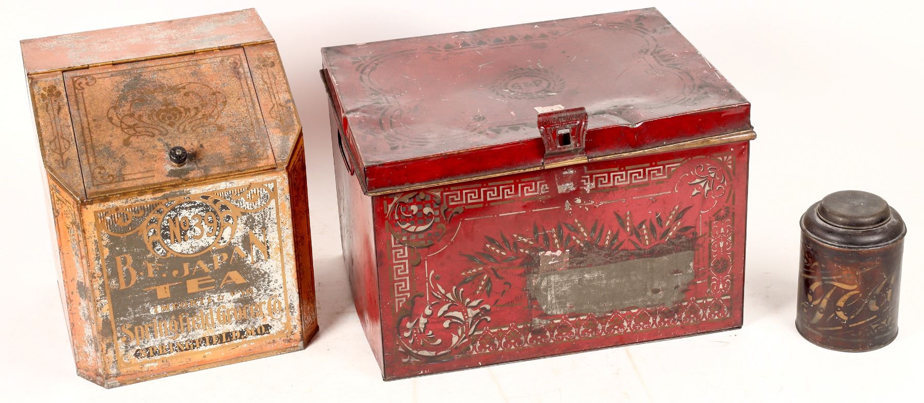 Tea boxes (2) and a tea container. First is a porcelain painted box that measures 15"x 12"x 10" and there is the number 53 and the initials G&P, It has several dents but is still usable. Next, a tea box measuring 12"x 10"x 10". It is labeled B.F. Japan Tea No. 39. Lastly is a small 4"x 6" tea cannister for home use. Please see photos for more details. Gary Bracken Collection