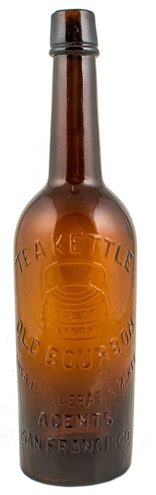 Tea Kettle Old Bourbon, Shea Bocqueraz & McKee, agents, San Francisco. Thomas number 136. This is probably the most popular western whiskey by far, particularly because of the full faced embossing with a picture of a tea kettle. They were mainly prevalent in Virginia City, Nevada, and very popular during the Comstock mining days of the 1870s. This bottle dates generally to the 1870s and early 1880s. Nice classic example of this applied top whiskey bottle with crude glass swirls in the lip. City: San Francisco State: California Inventory Number: 38169