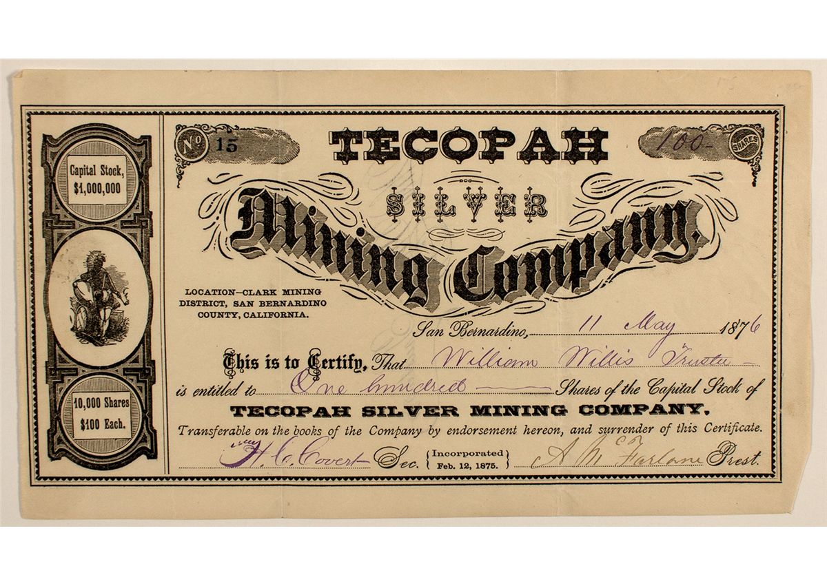 Stock no. 15 issued to William Mills Trustee on May 11, 1876 for 100 shares. It was incorporated on February 12, 1875 and located in the Clark Mining District. There is no printer identified. The stock features a vignette of a Native man on the left side. The piece has some wear, including creases and bent edges on the upper left and lower right corners. The Clark Mining District was a fairly new venture in the mining world, having only been created a few years earlier. Little information could be found on this particular mining company, although there is mention of a "Tecopa" Mining Company in the Jul 11, 1908 issue of the Engineering and Mining Journal, Vol. 8.City: County: San BernardinoState: CADate: 1876