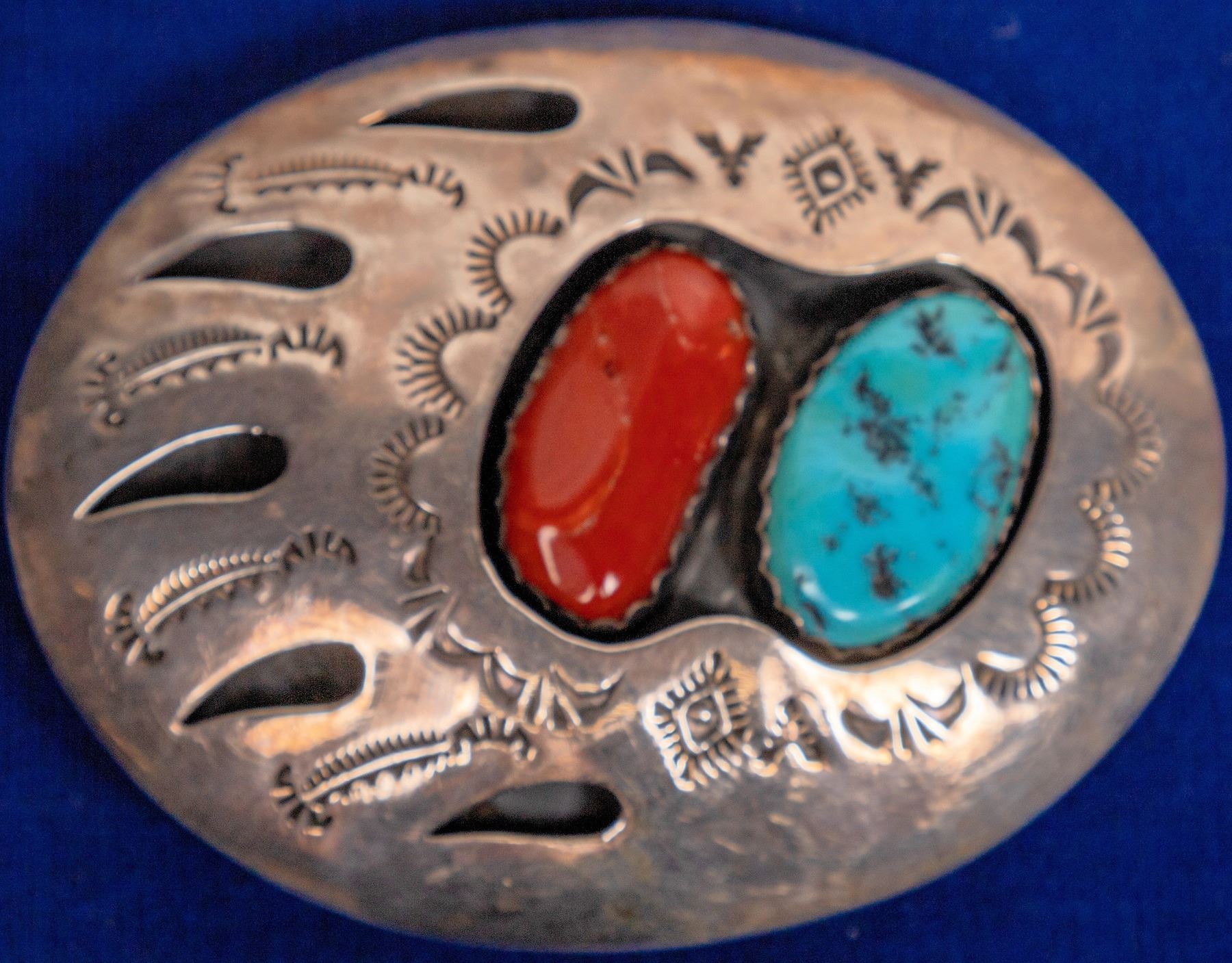 Teddy Goodluck (hallmarked TG inside four leaf clover) sterling silver shadowbox belt buckle set with turquoise and coral stones. Oval shape with etched silver and bear claw in shadowbox design. 3" x 2.5". Beautiful piece.