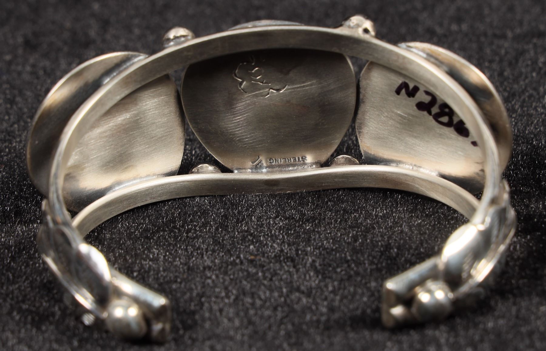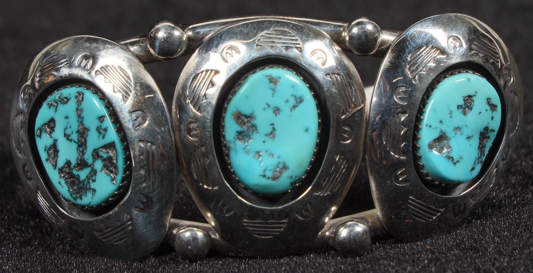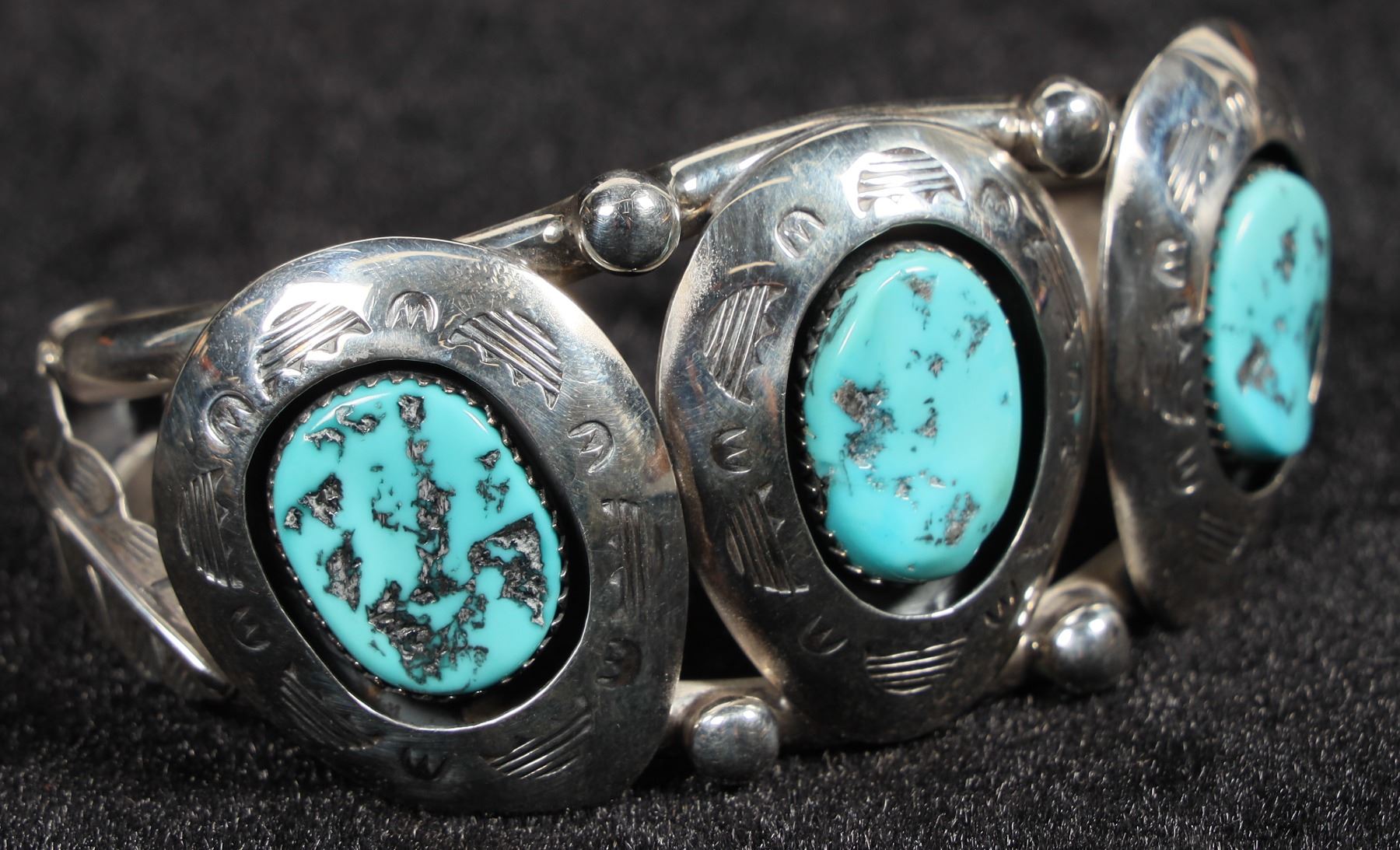 This is a beautiful and very desirable turquoise bracelet by noted Navajo silversmith Teddy Goodluck JR. of the Navajo Meadow Clan, Teddy learned from his father Teddy Sr. and Teddy's work has known to been featured at Yazzie's Indian Art in Gallup, NM. This bracelet is done in the Shadow Box style, has three what looks to be Bisbee Mine turquoise stones, measures 2 ¼" at widest inside point and has Teddy's TG inside a tree hallmark.