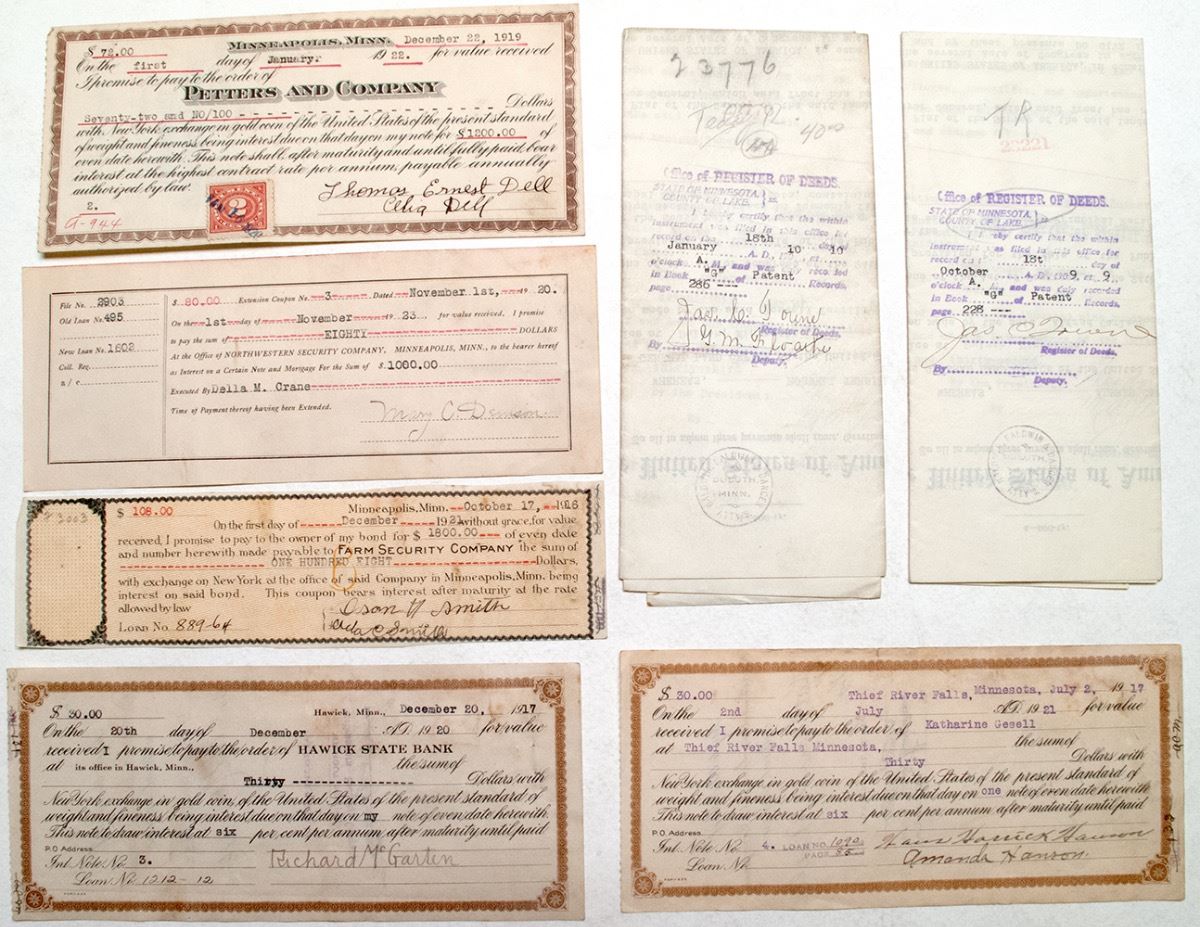 1) 1908 land grant to Roswell Terrill for 120 acres. 2) 1908 and grant to Alfred Carlson for 160 acres. Both under T. Roosevelt, but not his signature. Five promissory papers from Thief River Falls, Hawick State Bank of Hawick, Petters and Company of Minneapolis, Northwestern Security of Minneapolis, and Farm Security Company of Minneapolis. 1916-1920 City: State: Minnesota Date: hwac# 3769