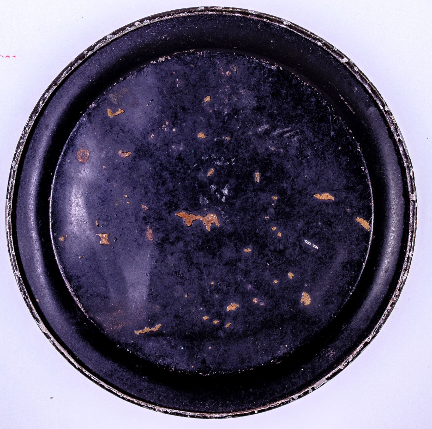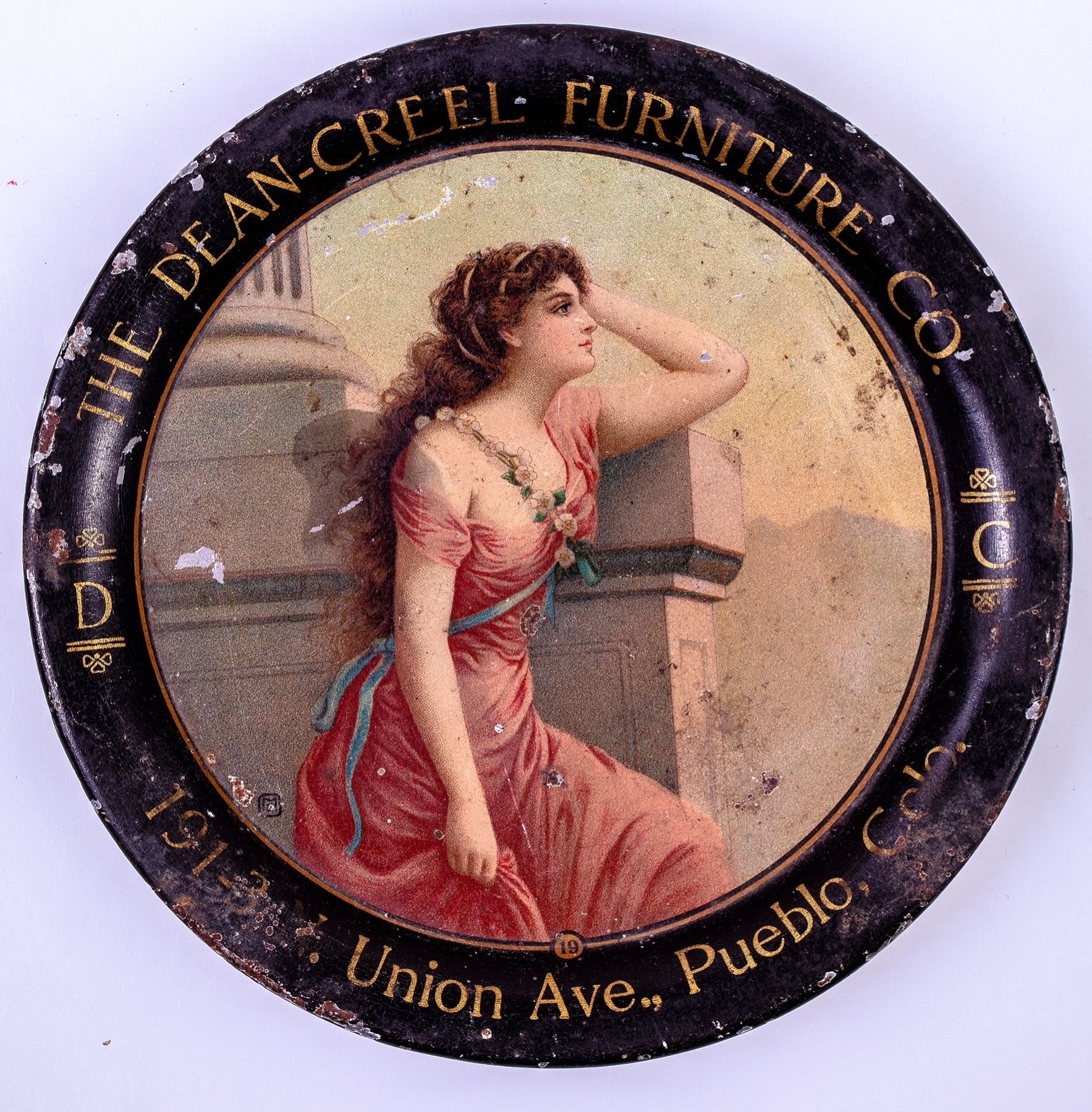 4.25" metal tip tray. The Dean-Creel Furniture Co., Pueblo, Colorado. Chips on front and reverse.