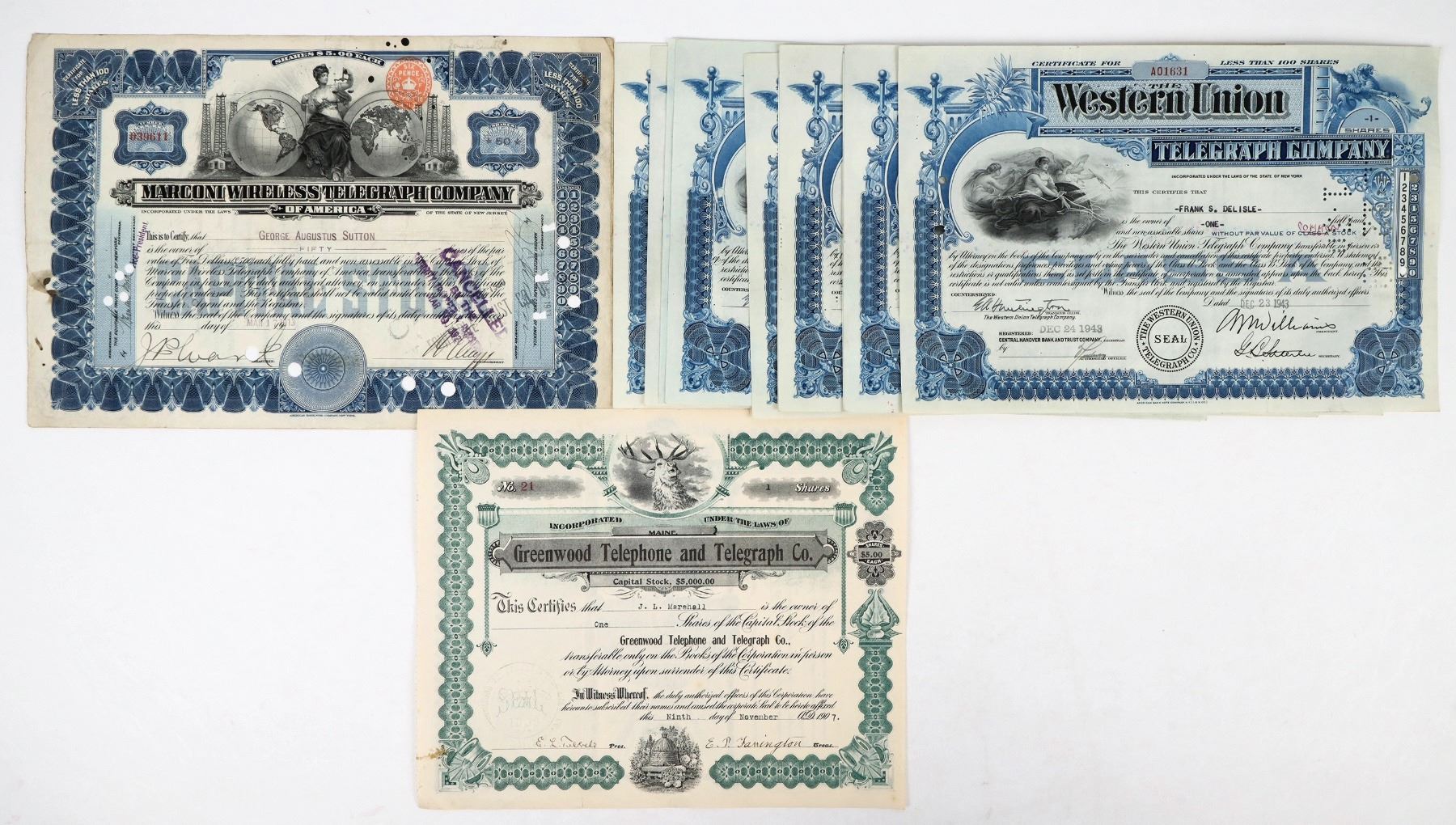 Twelve stock certificates from telegraph companies: Marconi Wireless Telegraph (1913); Greenwood Telephone and Telegraph (1907); Western Union Telegraph Company (10) (1943).