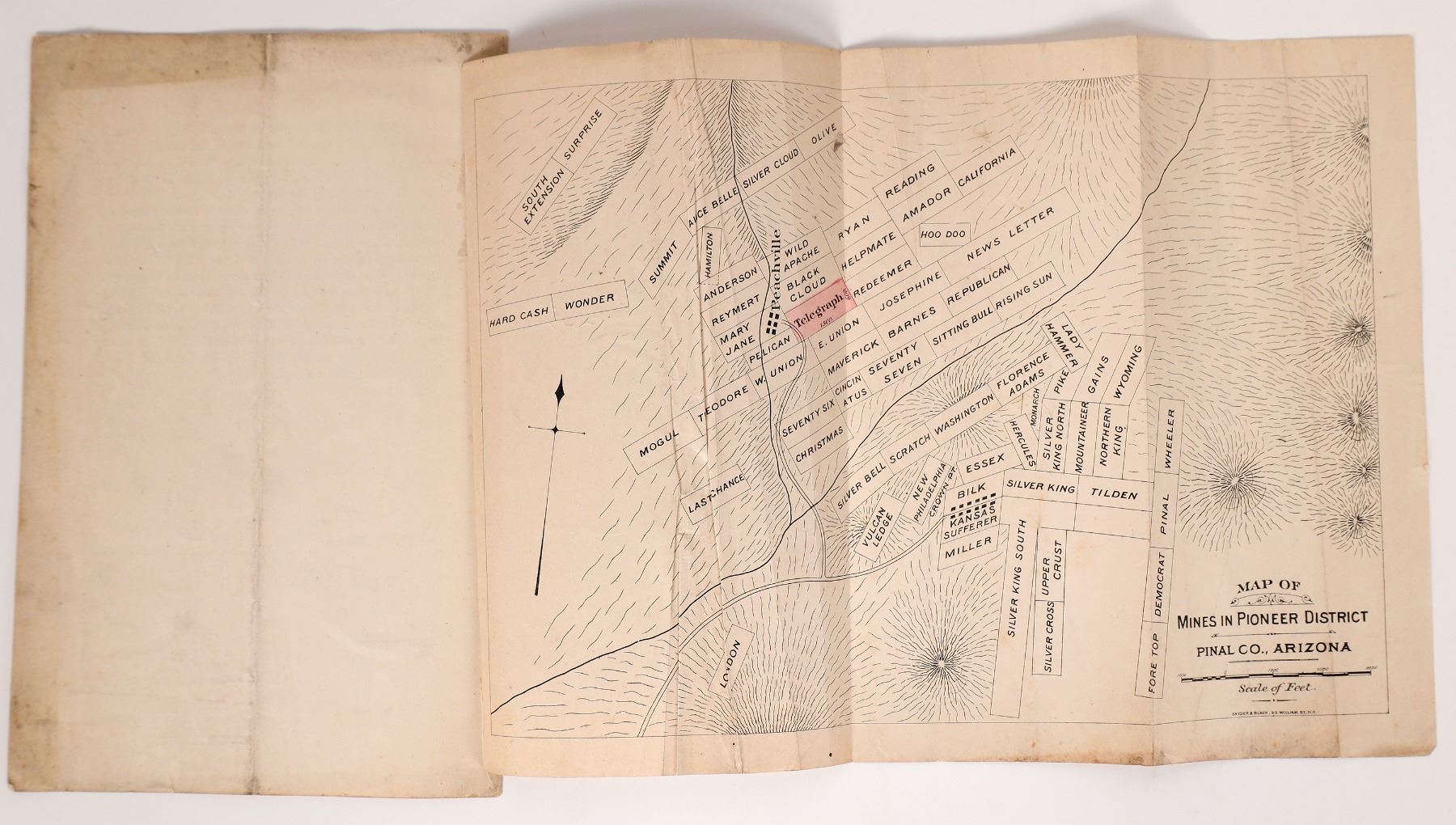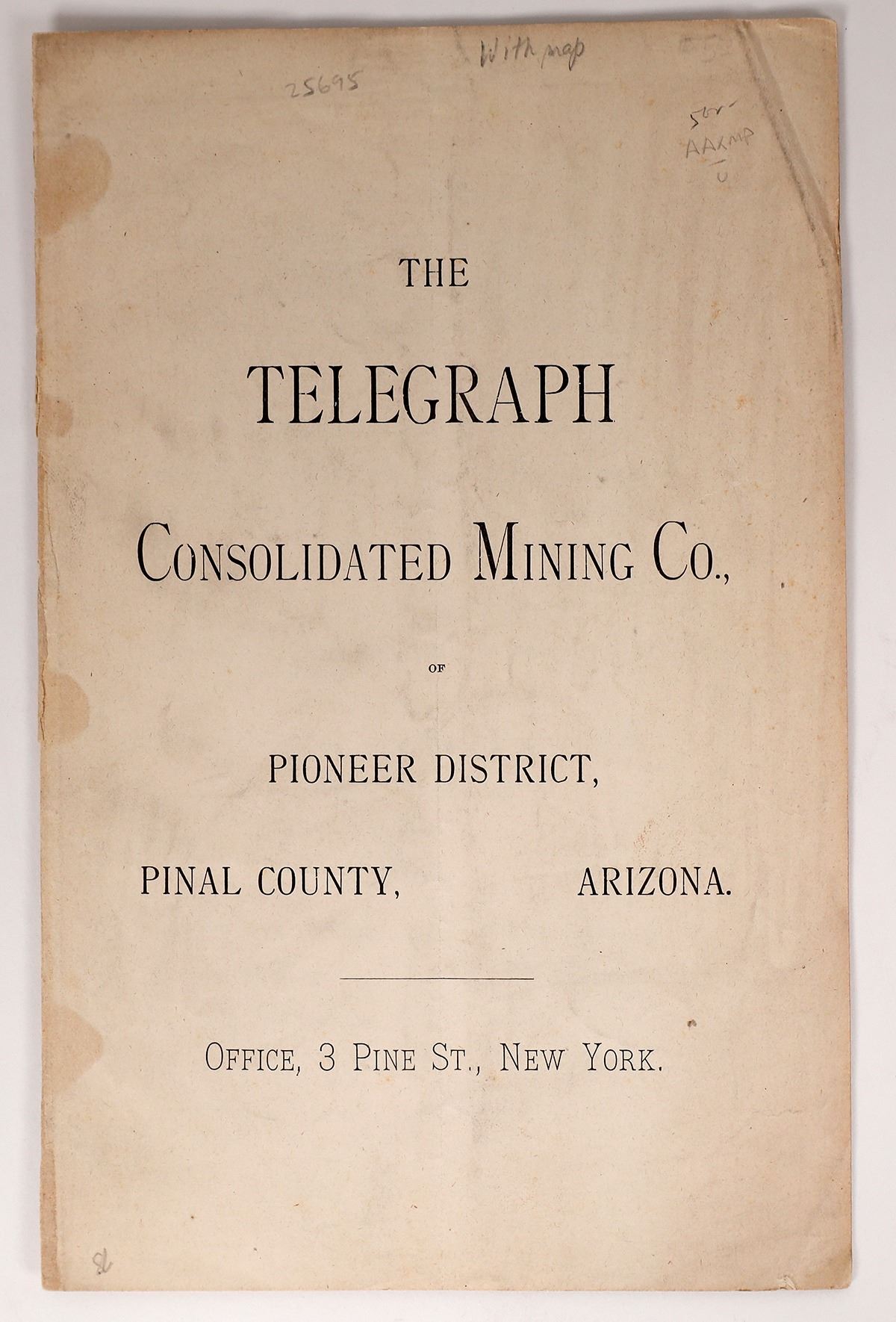 c. 1880 7pp prospectus and foldout map for Telegraph Cons. Mining Co. of Pioneer District, Pinal County, Arizona. They owned several mining properties in Arizona including The Monday Morning, Ground Hog and Nabob, all about 1 mile northwest from the Silver King mine in the Pinal Mountain Range. Nice foldout map shows the locations of their mining properties with Telegraph lands colored pink. Vertical fold and upper right crease, light stains on cover. Please inspect. Pinal County Arizona