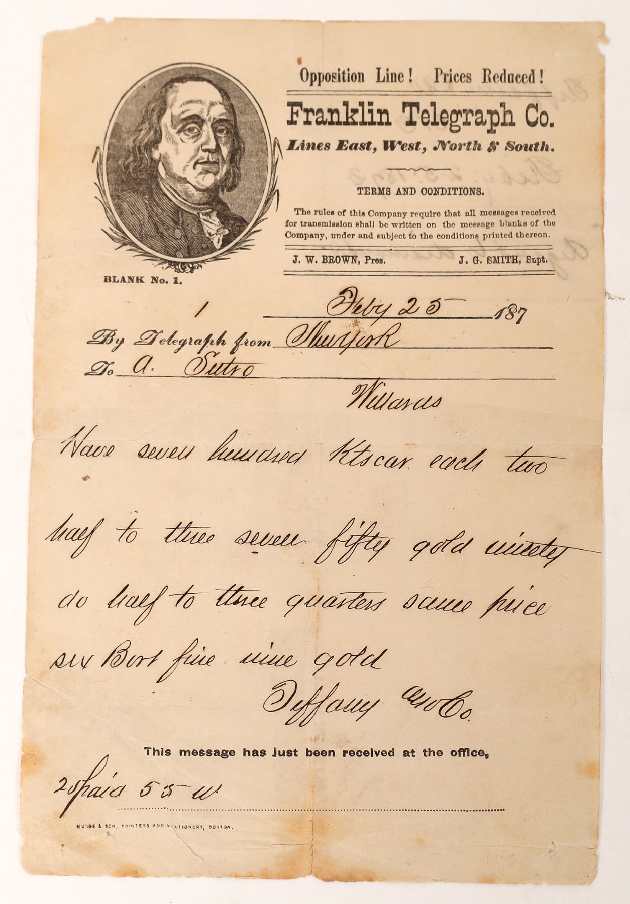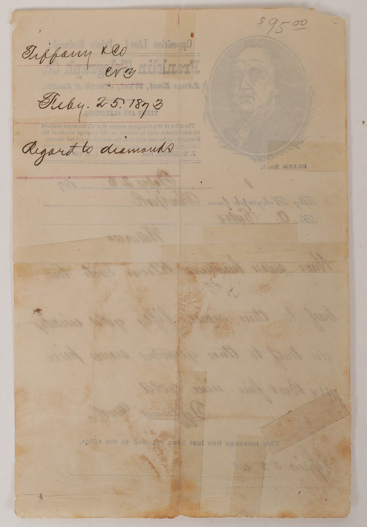 Rare c. 1873 Franklin Telegraph from Tiffany's, New York, to A Sutro concerning diamonds. Tape on verso, see photo. California