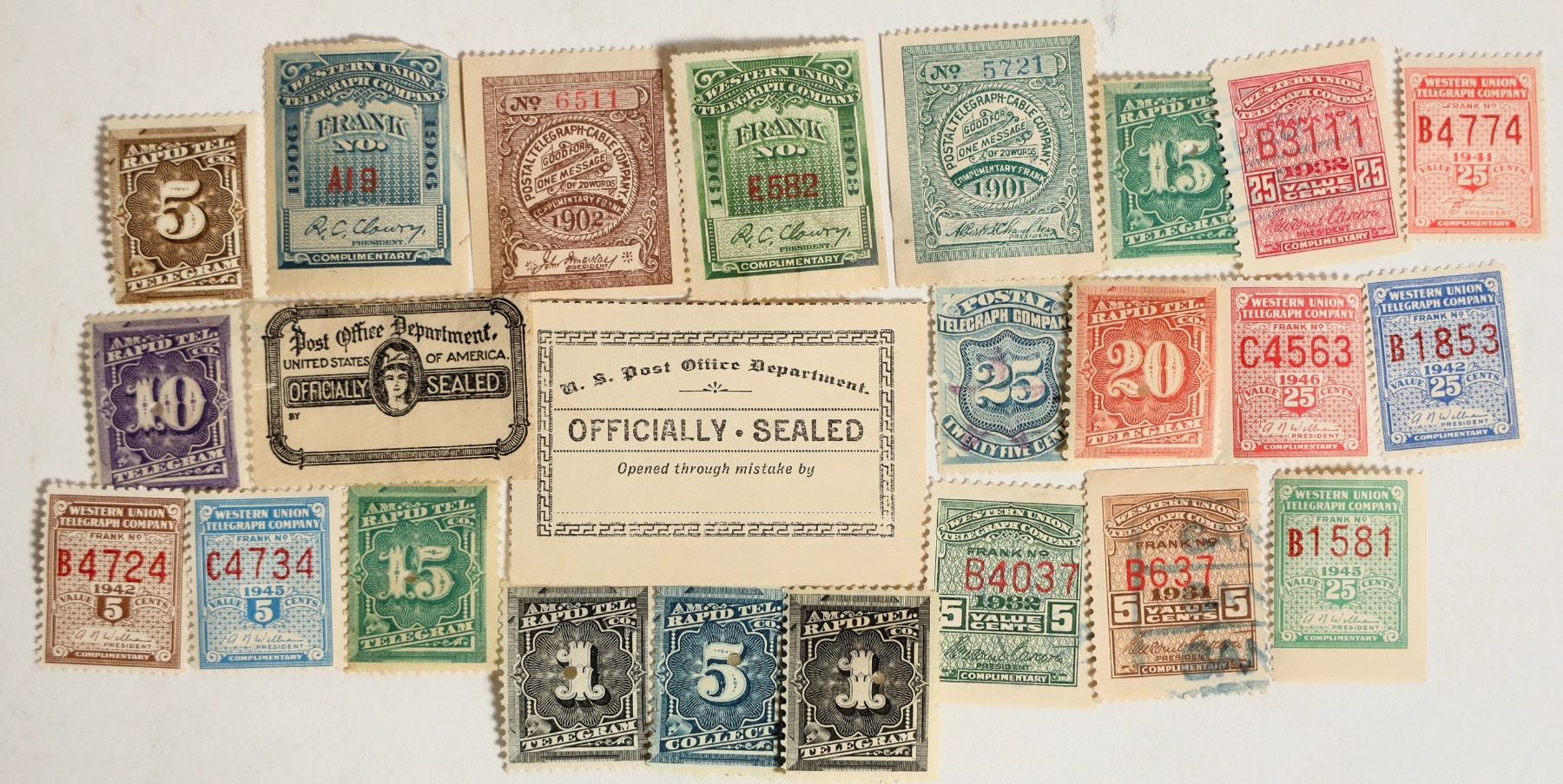 Telegraph stamp collection, about 20 stamps in good condition. Visually appealing, very crisp and saturated designs. Most are reasonably centered. See photo.