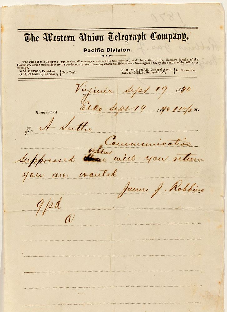 Really neat Western Union Telegraph Company Notice for a message sent from Virginia City to Adolph Sutro. Message received in Elko, September 19th, 1870. Message is as follows: "Communication suppressed when will you return you are wanted." They were having secrecy problems! Signed by James J. Robbins. Robbins is not listed in the 1868 Nevada directory. He appears in the 1871 directory and is listed as an attorney. Given that he also doesn't appear in Thompson & West (1881), he was probably not in Nevada for very long. Measures 7.75" x 5.5." Folds and light toning.