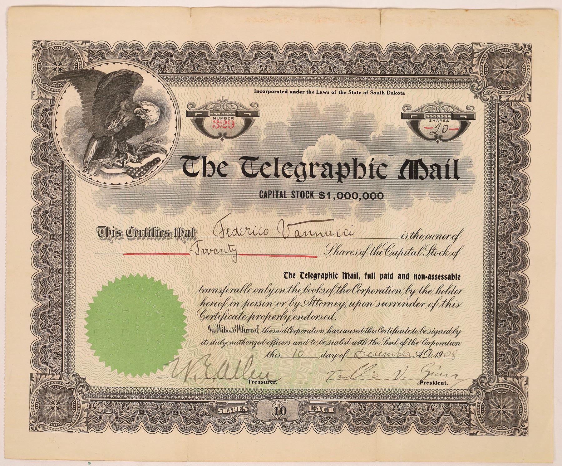Inc. in South Dakota. No. 329, issued for 20 shares to Federico Vannucci in 1908. Signed by the president, Tullio Giara, and treasurer Allen. Not cancelled. Black border and print, green seal, and bald eagle vignette. Deep folds with some separation. 9.25 x 11.25" Giara of Milan, developed the Telegraphic Mail, a multiplex telegraph system in 1904-05, which became a diplex typewriting telegraph in 1911.
